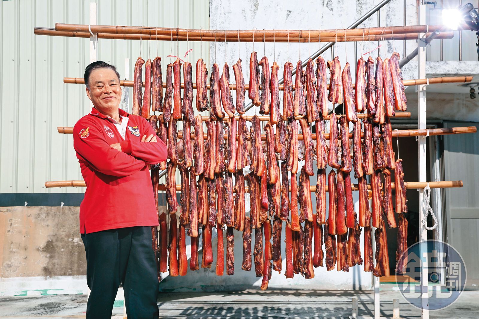 曬架的另一頭是田定忠的工作間,桶子裡放了前一日用58度金門高粱酒、八角等香料醃漬的臘肉,24小時翻缸一次,得醃上4天才能曬。「很辛苦耶,手會痠的,但不翻的話,肉沒醃入味。」家鄉味一做40年,田定忠拿起一條臘肉,笑嘻嘻地展示,「醃臘肉要捨得本才做得好吃。你來看,每一條肥瘦都很均勻,我這(臘肉)是林志玲的身材。」