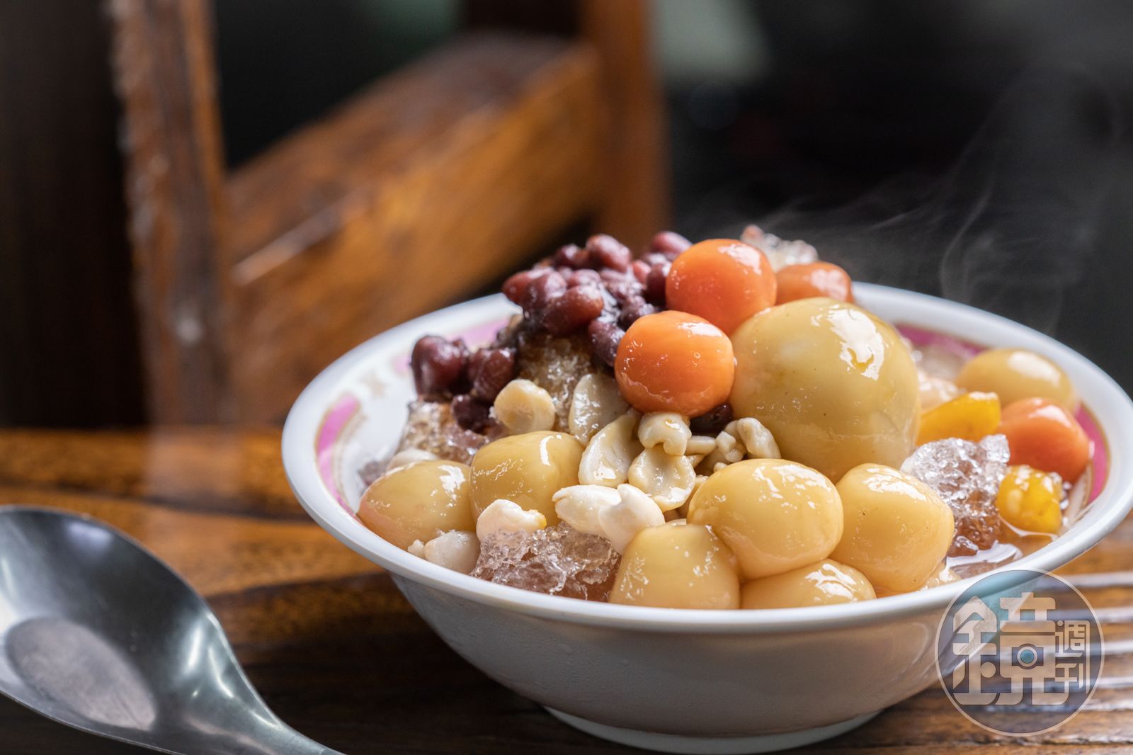 包餡湯圓、小湯圓會在攤頭側邊的一個小檯子上現搓現包,丟入一樣是冬季限定的桂圓湯裡煮,和配料一起堆在碎冰上,成了隱藏版「冷熱圓仔冰」,熱呼呼的甜餡和沁涼碎冰,冷熱交融,就像冬夏在嘴裡相遇。