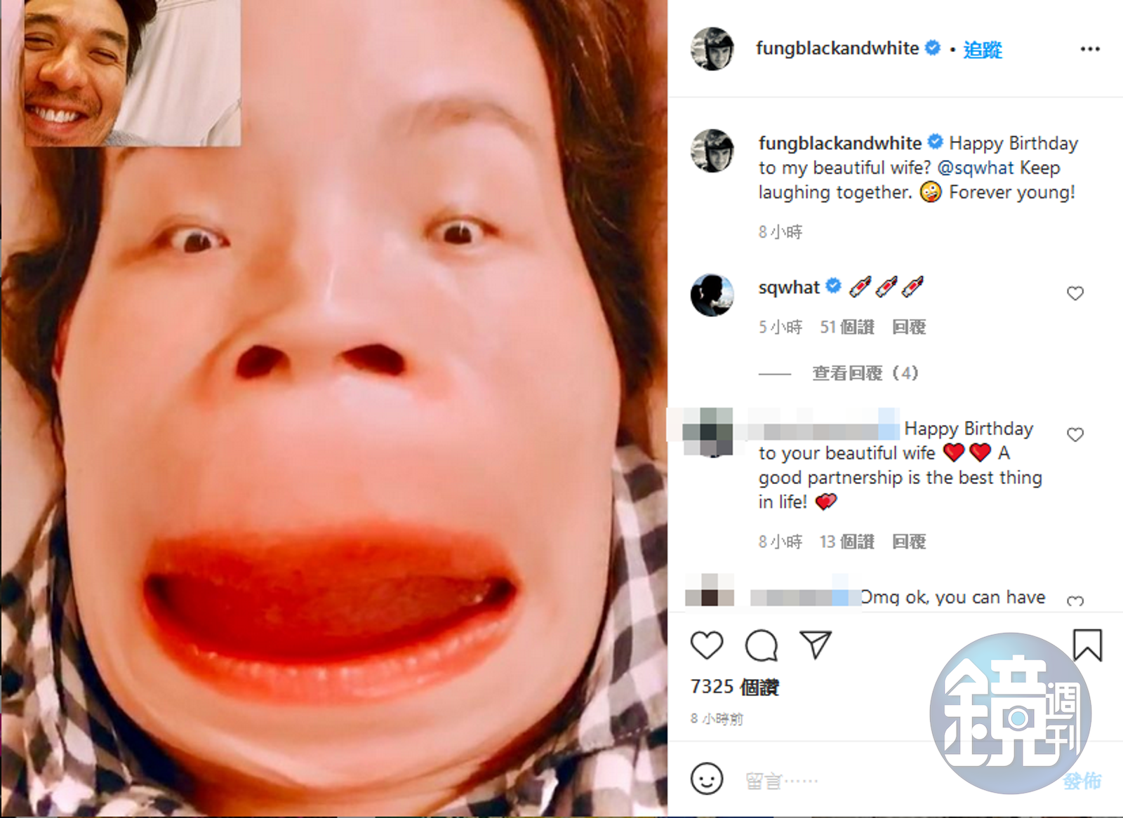 因為疫情緣故,之前馮德倫曾來台避疫兼陪伴老婆舒淇,不過如今已返香港,但老婆大人生日,馮德倫也開了視訊與舒淇連線,祝賀他生日快樂。但正所謂「相愛相殺」,馮德倫卻在IG貼出一張他與舒淇視訊時,他利用濾鏡把舒淇弄成豬鼻大嘴的照片,而自己卻躲在畫面上方得意奸笑的照片,但配文卻是滿滿的粉紅泡泡「Happy Birthday to my beautiful wife?Keep laughing together. Forever young!」