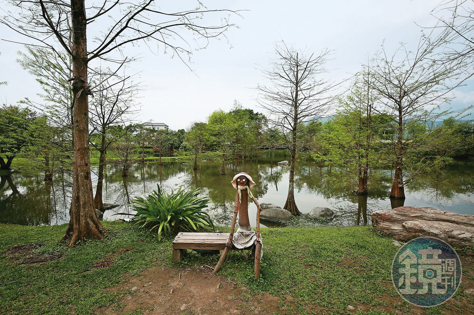 位在花蓮吉安、台九省道旁的景觀餐廳「松湖驛站」,若非在此停下腳步,很難發現戶外庭園暗藏如迷你版「雲山水」的湖光山色。停好車,首先映入眼簾的是周邊種植不少落羽松的池塘,幾隻紅面番鴨在水面上自在悠遊,只可惜落羽松正值落葉期,想必春天萌發新綠的嫩葉倒映水中又是另番美景。除了水池外,旁邊還有大片草坪,一輛廢棄的農耕車化身為應景的大型盆栽裝置,倒也十分可愛。