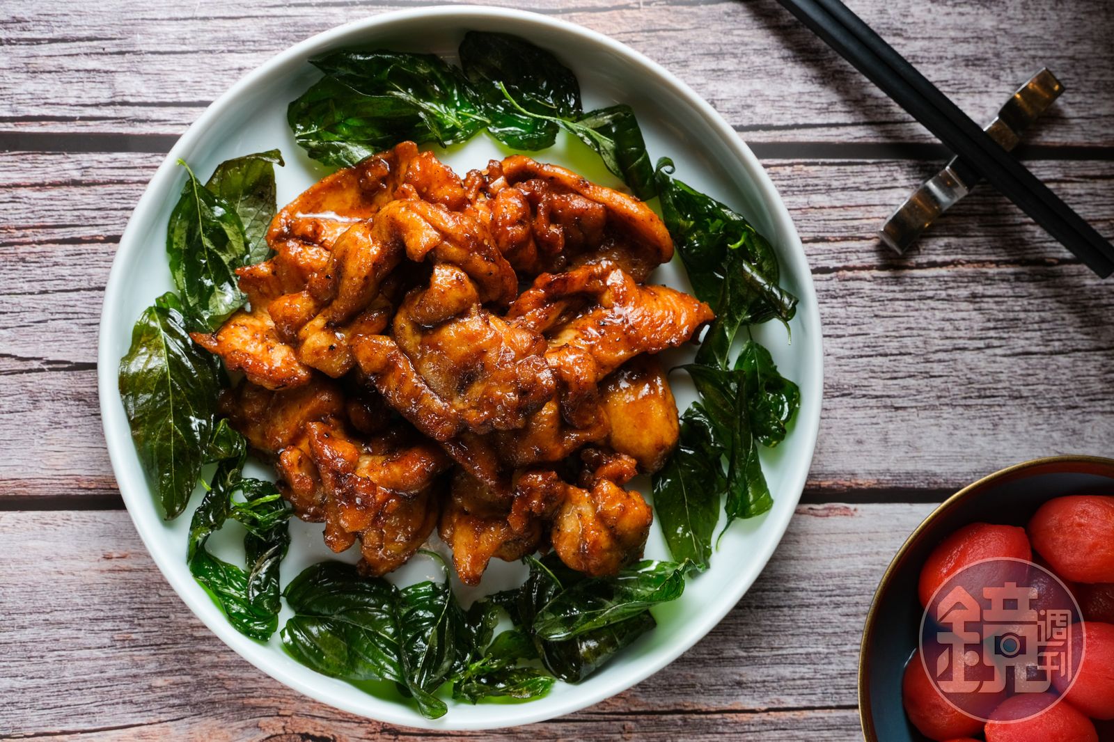 醬色紅艷的「碧綠川椒雞」也是正宗潮州老菜,需將川椒粒炒香打碎成粉,再加入剁細的蔥末炒香,炒完的粉像黑胡椒鹽,與醃漬、過油的雞肉拌炒,搭配炸過的珍珠葉或九層塔一起吃,香濃麻香的嫩滑雞肉,惹味又下飯。