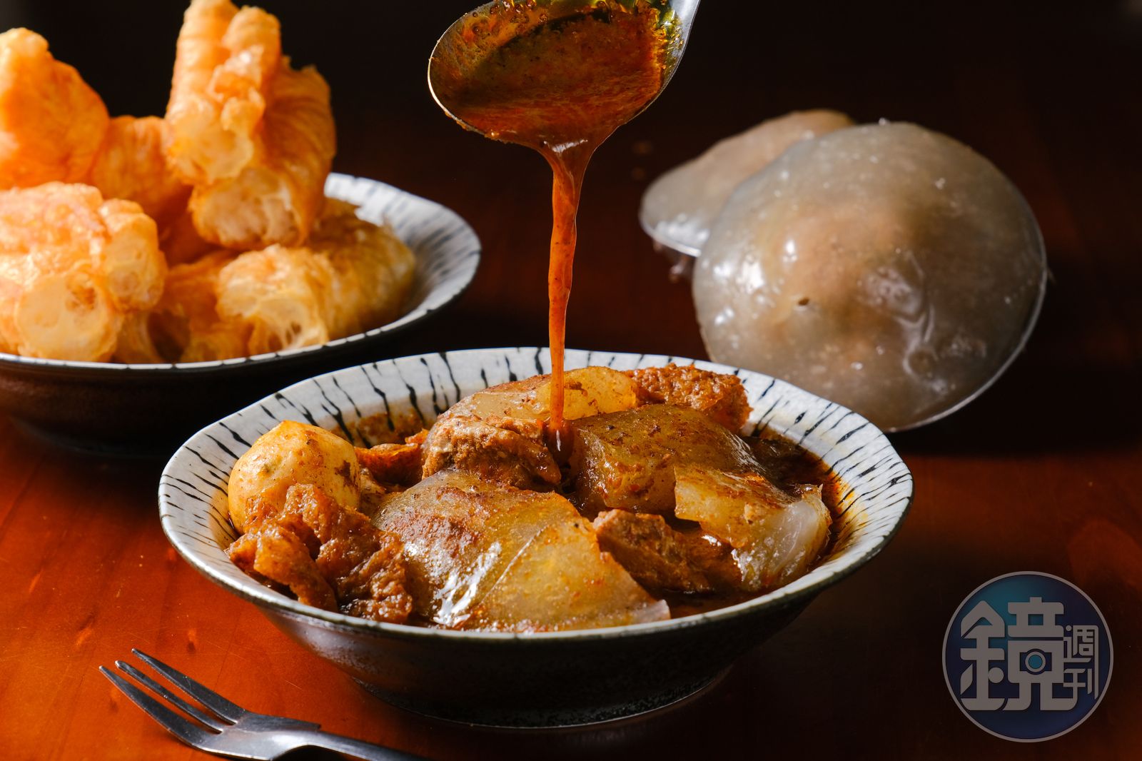 「麻辣肉圓」從香港麻辣魚蛋找到靈感,湯底香麻不辣,Q彈的爆豬皮與肉圓皮相當速配。(80元/份)彰化肉圓也發展出諸多門派,光是油溫,就能分出高溫酥炸、中溫Q韌、低溫軟嫩等不同口感,正彰化肉圓採先低溫、再中高溫的兩段式炸法,充分發揮地瓜粉皮的Q彈優勢。