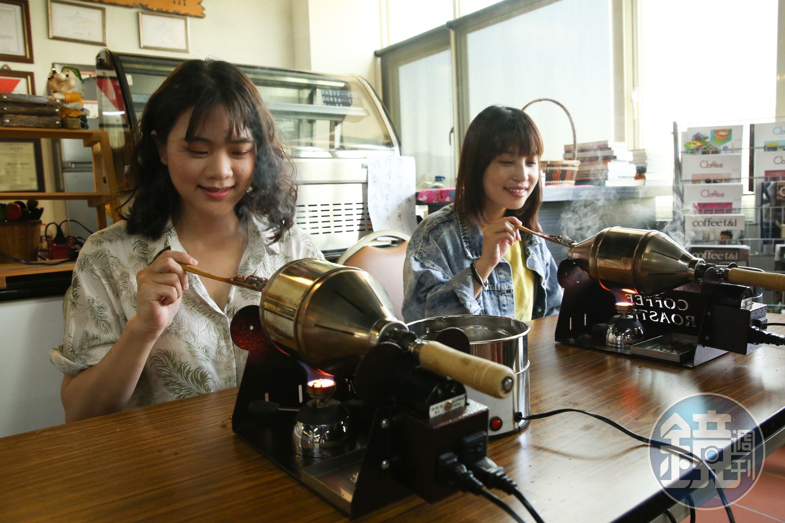 來到百勝村不只可以品咖啡,還能現場體驗將咖啡烘出完美中焙的成就感。烘豆鍋預熱5分鐘,放入100克莊園自產的水洗豆,看著它們從草綠色、黃色轉化到肉桂色,最後聽見爆裂聲,即表示進入成熟的淺中焙階段,約莫等候10秒鐘,就是絕佳的中焙了。