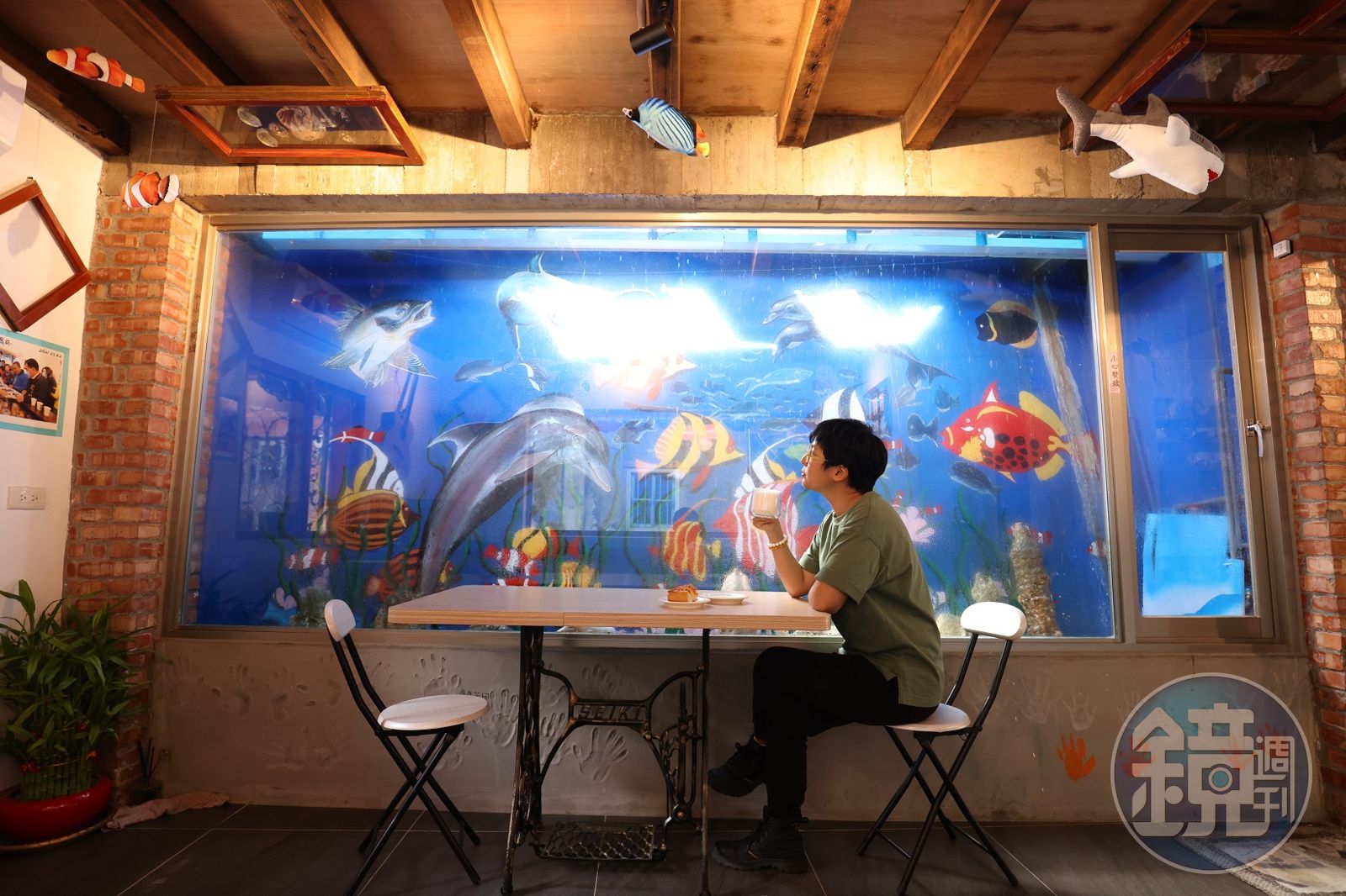 呂雲美喜歡壁畫,她找來「古趣咖啡屋」店主吳古趣在屋側畫出舊時代牡丹家戶的風景,隔壁是豬肉攤,對面是布店,濃郁色彩讓人頓時穿越進入牡丹過往的熱鬧年代。屋子裡頭有個水族牆,呂雲美畫上魚群、設計出水幕,坐在店內也有風景可看。