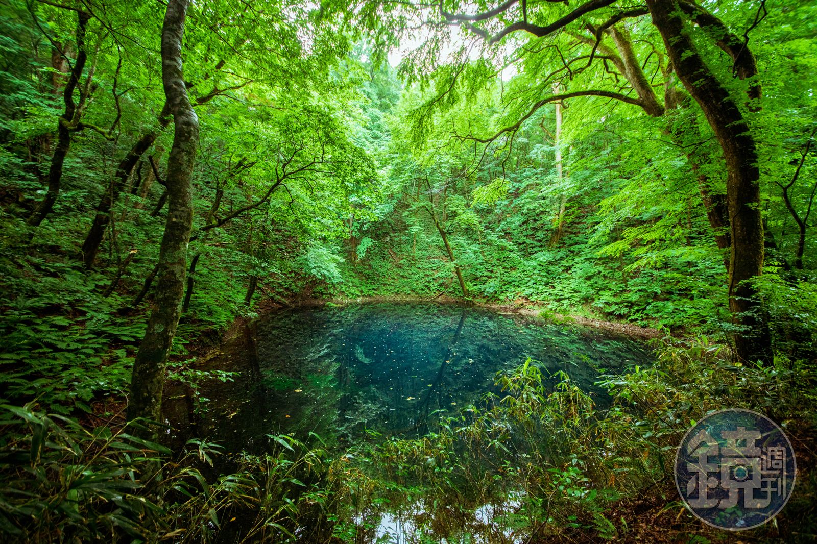 前往青池的來回道路上,最迷人處在於夏季可見的漫山鮮綠。白神山地從4月開始迎來新綠,也是健行起始的季節,隨著進入盛暑,新綠轉濃,又是不同面貌。從停車場開始進入山間,順著步道,大約走15分鐘便可輕鬆抵達傳說中透露藍寶石光澤的「青池」。透澈幾乎能見底的湖水,水下枯枝清晰可見,藍綠顏色的水面平靜無波,神秘的氣氛讓人平靜而陶醉。