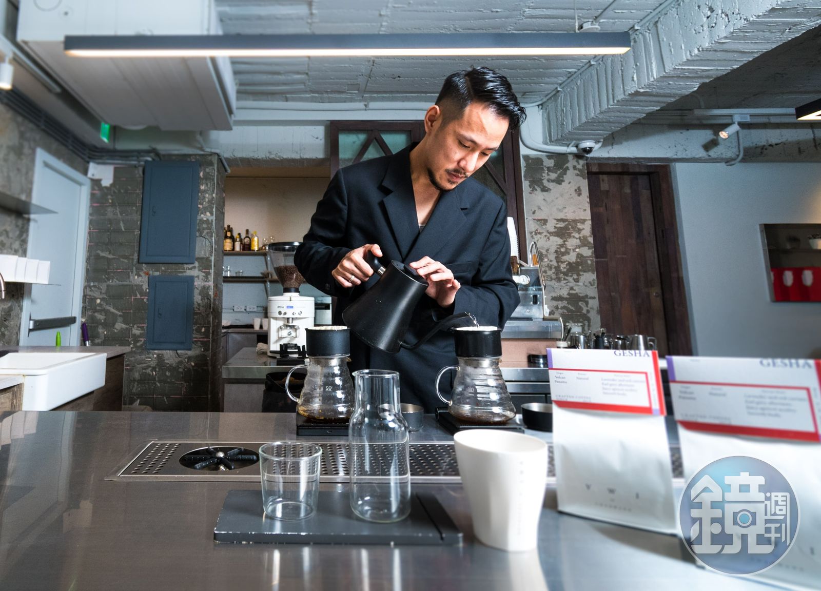 2017年的「世界咖啡沖煮大賽」冠軍王策,於自創品牌VWI沖煮咖啡。發布時間:2021.12.08 13:57 臺北時間