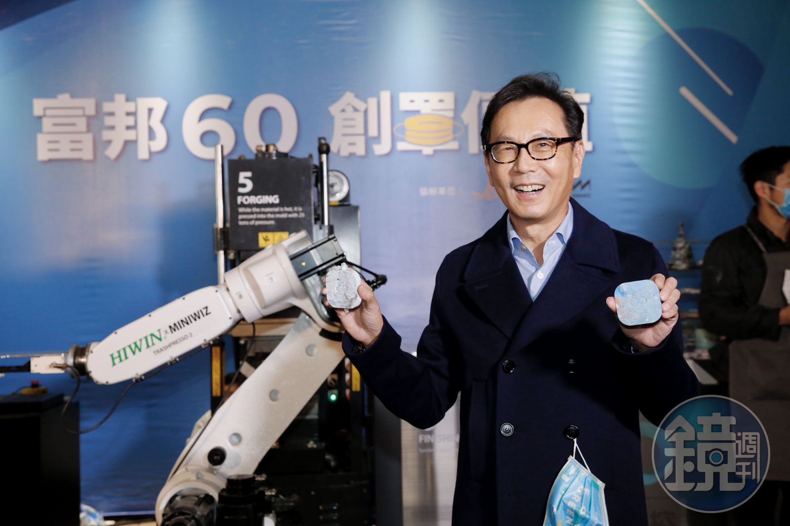富邦集團今年60週年慶,蔡明忠特別提到,富邦集團創辦人蔡萬才揭櫫富邦集團原則是誠信、勤儉,他過去認為節省就是勤儉,沒想到現在還能透過環保經濟獲利。 蔡明忠說,今年受到疫情衝擊,富邦也注意到廢棄口罩對環境帶來的負擔,特別與擅長運用科技解決垃圾問題的小智研發合作,把1年產生的1億口罩再利用,將廢棄口罩消毒,再製成「正能量手機充電板」作為員工紀念禮品。 蔡明忠也在受訪時表示:「台股萬八不是困難的事,很多人應該還有更高的期待。」