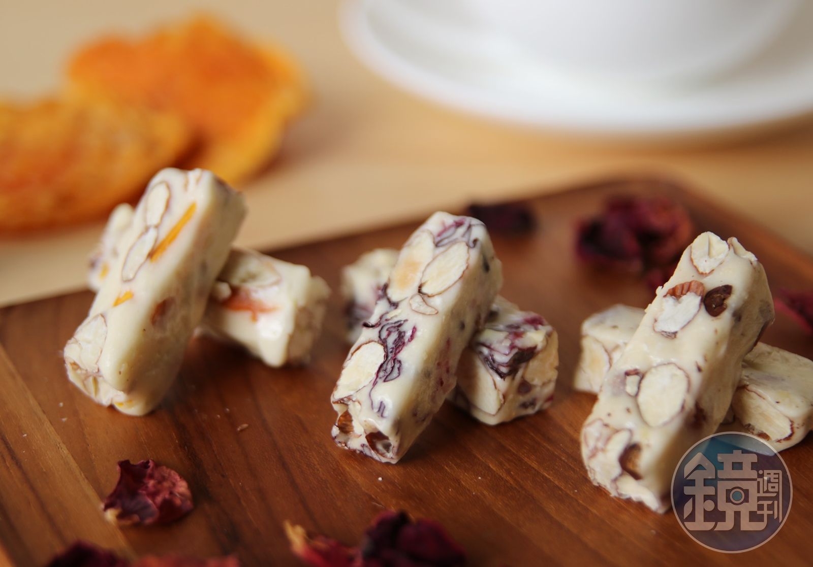 嚴選彰化糯米荔枝乾與埔里玫瑰做成的「玫瑰荔枝覆盆子牛軋糖」。(PEKOE提供)