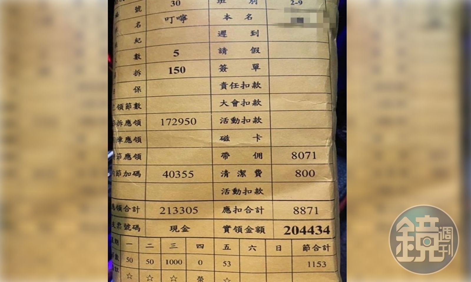有網友在臉書「爆廢公社二館」貼出小姐的薪資單,並寫道「其實你點的小姐,賺比你多」,從照片中可見,這名酒店小姐叫「叮嚀」,單上有項目「節拆應領」與「加碼金額」,分別為為17萬2,925元和40,355元,再扣除帶佣費、清潔費等其他費用後,一共領到20萬4,434元,且實際上班天數僅5天,不到一週的時間,收入竟如此驚人。