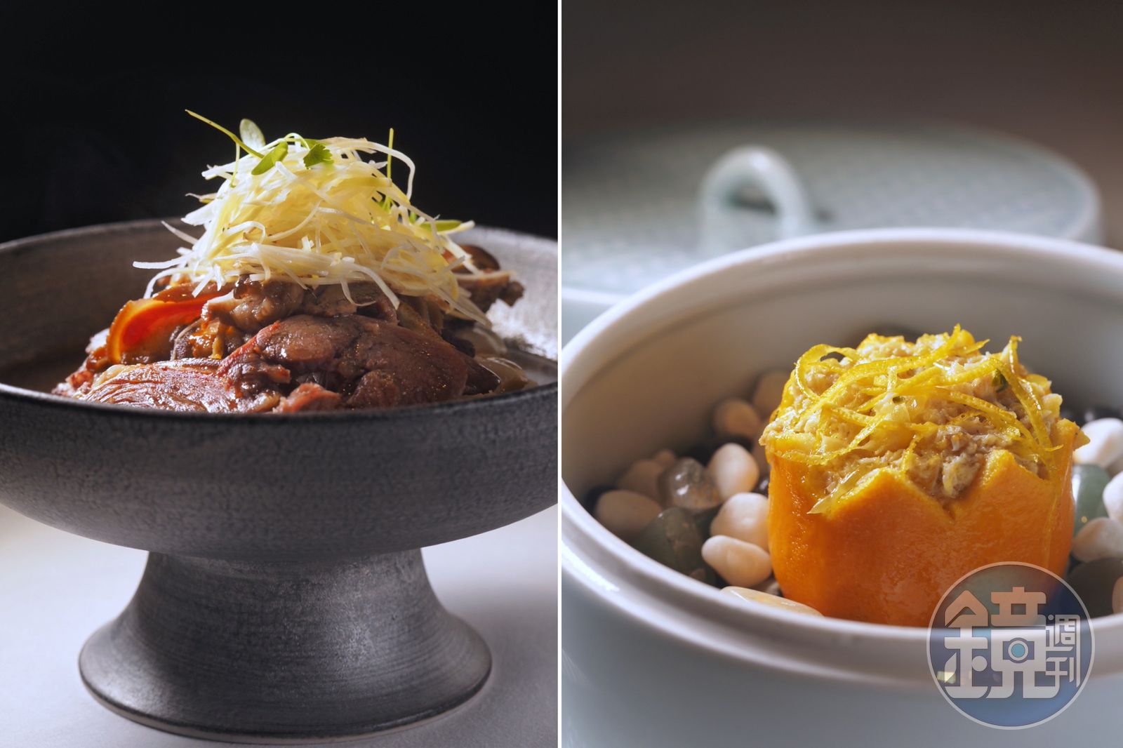 《山家清供》中記載的「蟹釀橙」作法是:「橙用黃熟大者截頂,剜去穰,留少液,以蟹膏肉實其內,仍以帶枝頂覆之,入小甑,用酒、醋、水蒸熟,用醋鹽供食,香而鮮,使人有新酒菊花、香橙螃蟹之興。」雖然不知道宋代的橙子是什麼品種,但宗哥的版本用果香甜美的香吉士,配上安徽女山湖來的手拆蟹粉,封進橙殼中用黃酒蒸,柑橘類的香氣鎮了腥,還讓蟹膏的濃香多點層次。