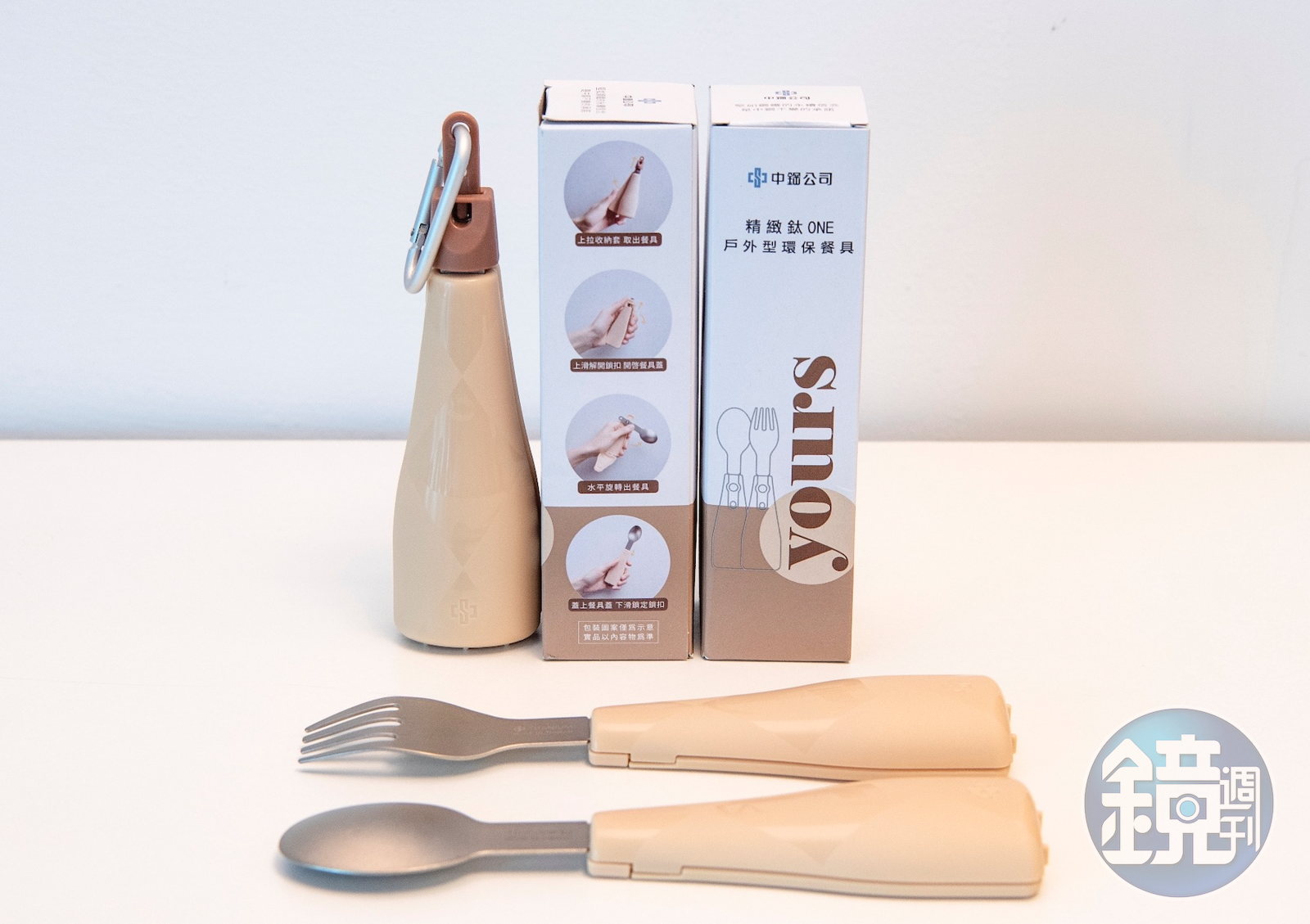 中鋼的股東會紀念品走實用美觀路線,今年是精緻鈦ONE戶外型環保餐具。(中鋼提供)