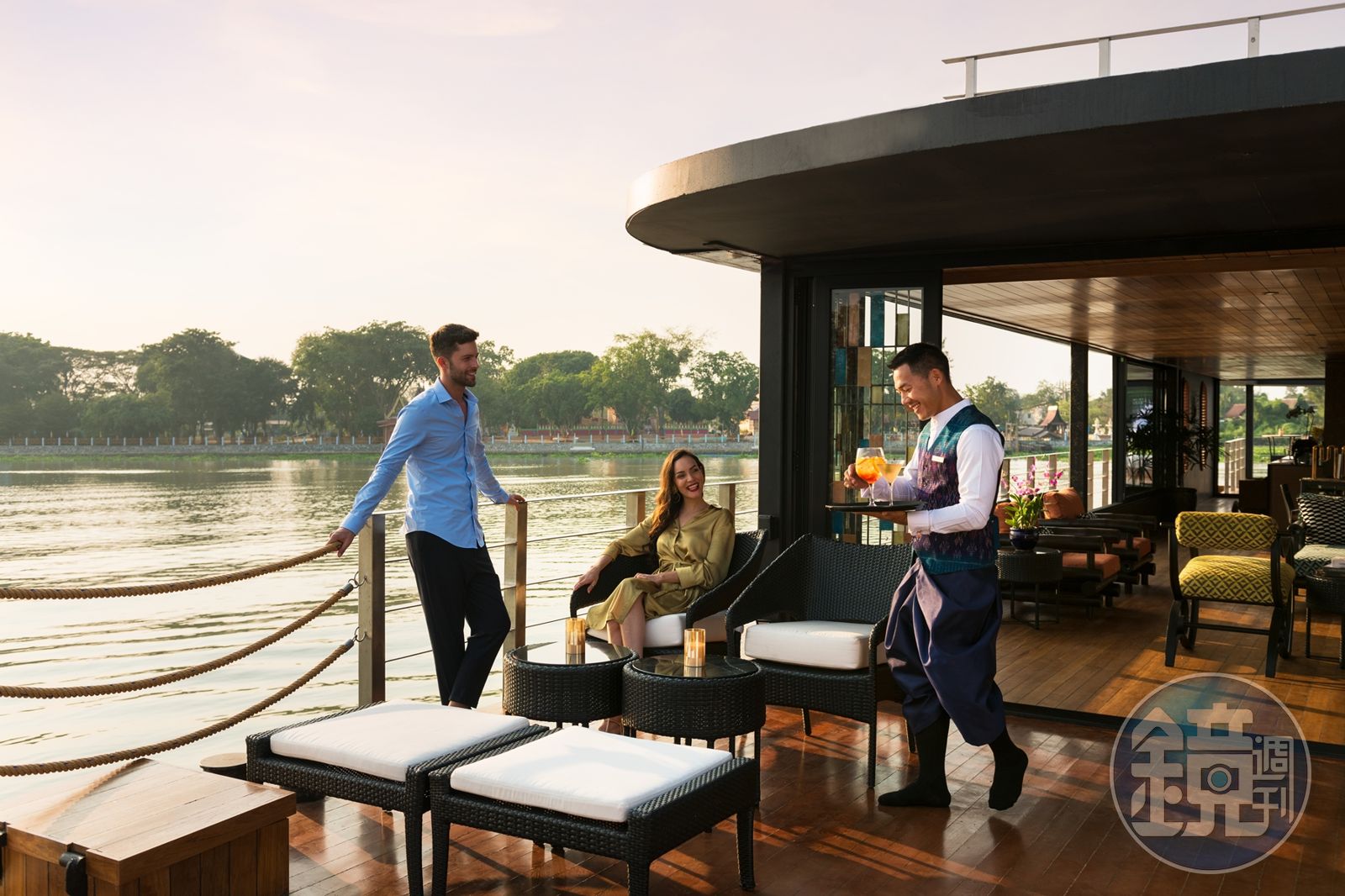 整艘遊船採用大地色系,嵌入其中的少許貴族黃、海洋藍,同精緻的金色交織,烘托著一件件古董藝術品,講述昭披耶河流域流傳千百年的故事和當地人水上航行的歷史。精湛的傳統工藝和地方特色令人聯想起古時暹羅王國的優雅風姿,精美的紡織品有著珠寶一般的華美色澤,營造出輕鬆又悅目的環境。舒適的休息區沐浴在迷人的自然光線之中,是靜心閱讀、間或抬眼欣賞四周美景的理想位置。