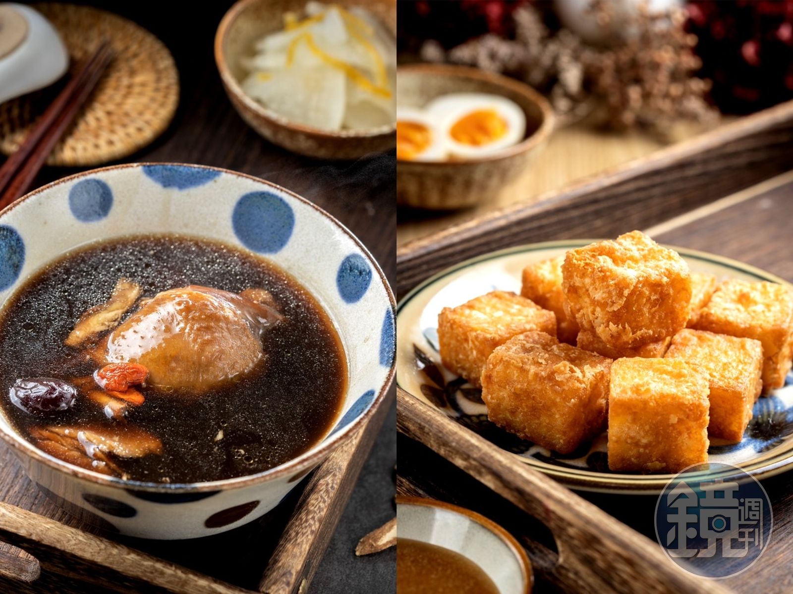 吳承翰改造傳統上滋味厚重、或許會令人卻步的藥膳湯,依照現代人的口味,在風味和補效間取得平衡。經典的「藥燉排骨湯」即使用了十幾種藥材入湯,入口卻不苦澀,反而清香順喉。自家研發的「高麗菜雞湯」則是運用高麗菜自帶的甘甜,拌鹽脫水後曬乾入湯,蔬菜與雞肉都燉到軟爛化口,吸滿了醇厚的湯汁。喜歡藥膳感強烈一點的,湯體溫潤厚實的「何首烏雞湯」苦中回甘,暖意上心頭之餘還順帶補足了血氣。