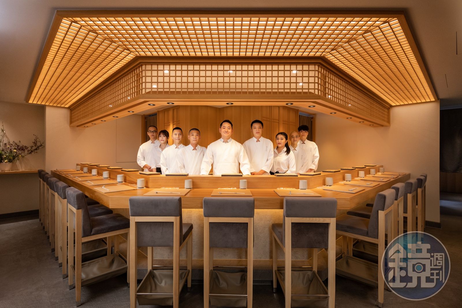 離「鮨天本」不遠,同樣座落台北東區頂級日料一級戰區的「登龍門」,保有如本店的低調素雅,14個板前座位,以暖調木材的和室窗櫺帶出柔和且樸實的氛圍,過去可用「神秘」來形容的老闆兼主廚天本昇吾,首度現身面對大陣仗的媒體,今日他不捏壽司,而是在板前「督導」旗下兩名弟子,確保用餐品質。