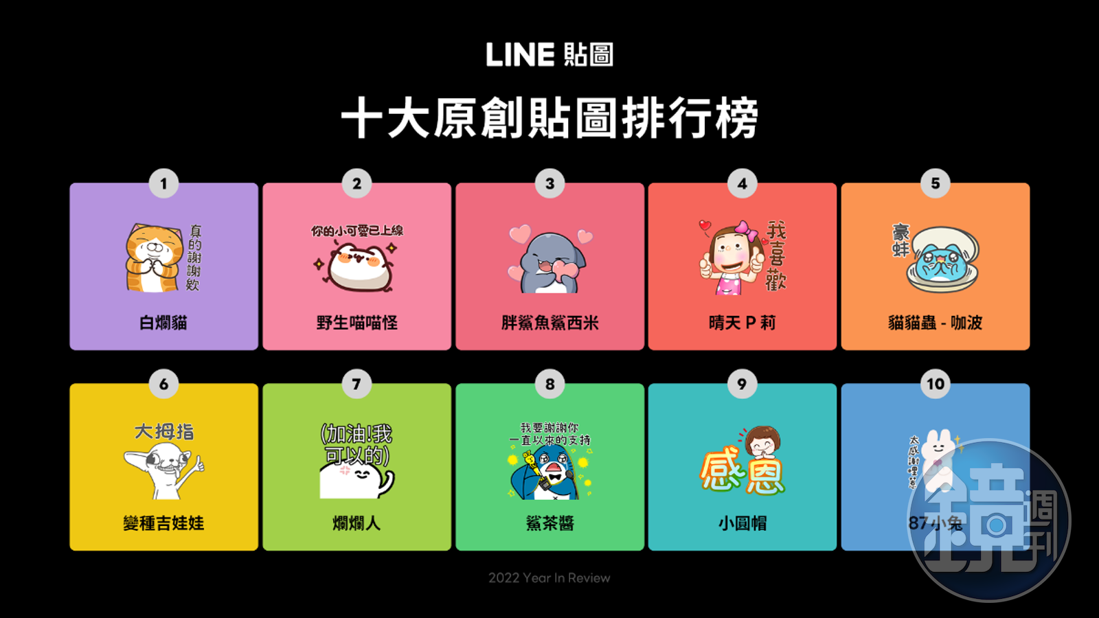 2022年LINE官方貼圖排行榜,由「好想兔」稱霸冠軍寶座,「白爛貓」與「貓貓蟲-咖波」人氣依舊,分別奪下亞、季軍。迪士尼角色「奇奇與蒂蒂」動態貼圖奪下第4名,第5名則是經典不敗的「BROWN & FRIENDS」。