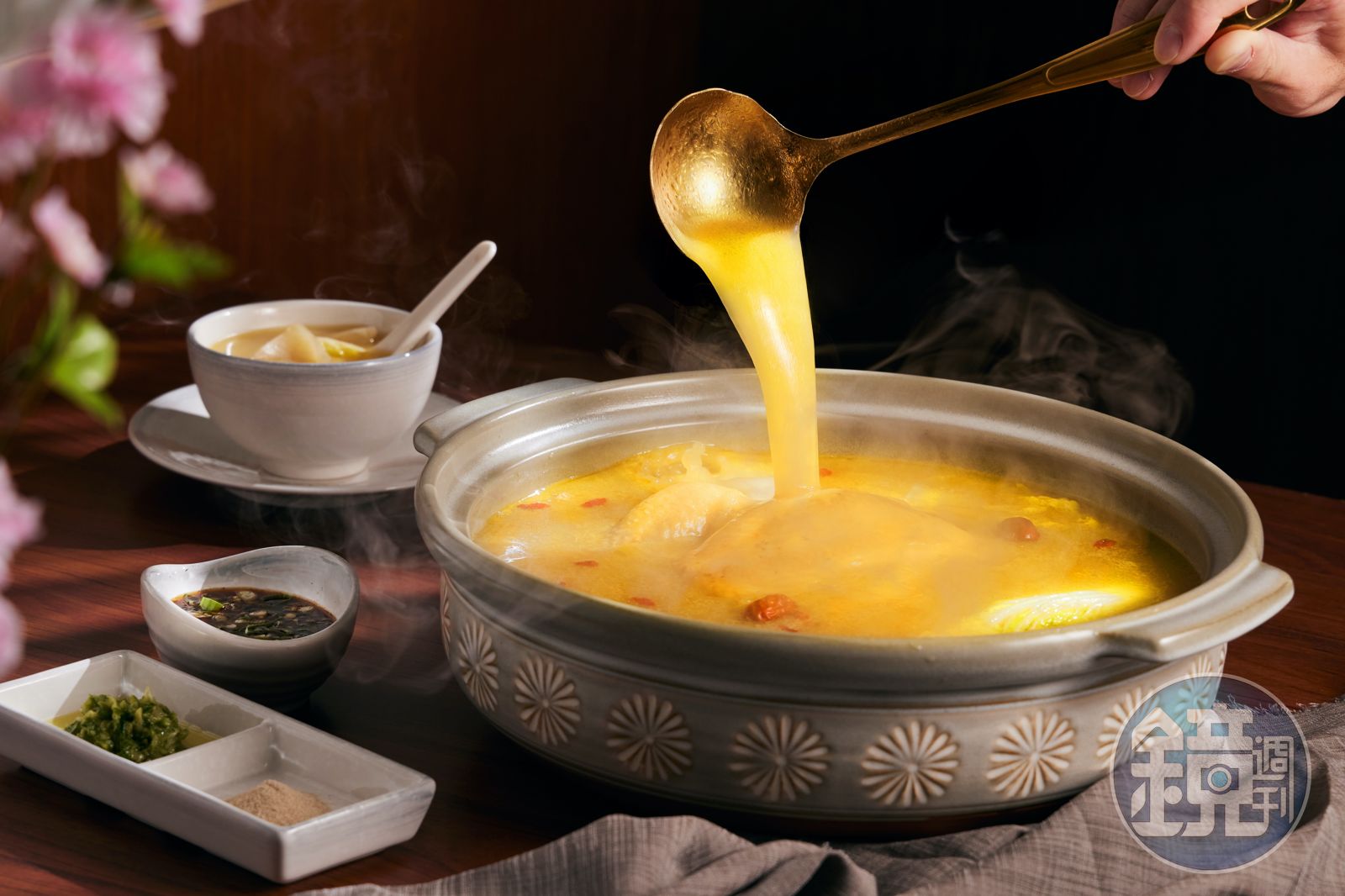 許益豪說:「招牌『黃金花膠雞湯鍋』湯頭選用來自南非一斤要價上萬元的高級野生鱸魚肚花膠熬煮。」還加入於阿里山山腳下放牧飼養的「玉米雞」跟嚴選帶骨火腿與北海道干貝等高級食材,3天慢熬出金黃鮮美的湯頭,也會隨鍋附上一份切片花膠讓客人涮煮品嘗,厚實花膠的嚼勁及滿滿的膠原蛋白,滿足女性客群嗑鍋兼滋補的願望。