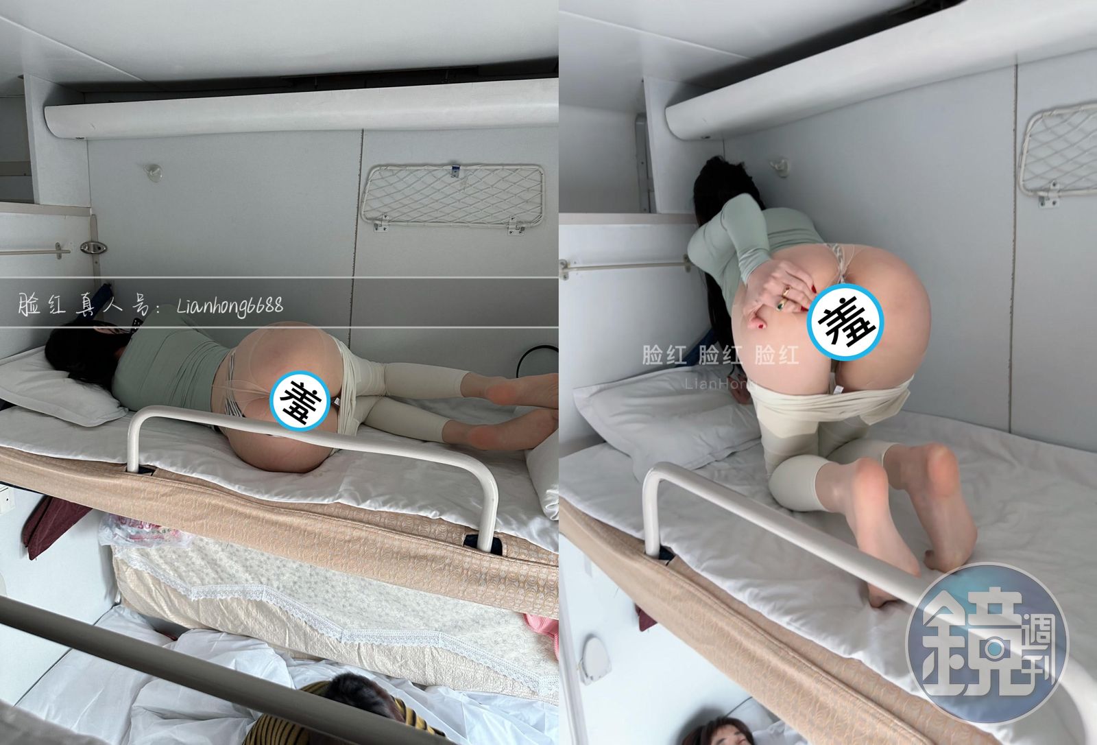情色網美「臉紅Dearie_」近期搭乘中國高鐵車廂,在上層臥鋪擺拍撩人辣照,她半脫長褲撅臀露出丁字褲,又撩起緊身衣擠出雪乳「搓頭」,完全把當時正在下鋪的其他男性乘客當成空氣。一票網友看了一連串辣照心癢癢,羨慕喊話:「下次搭車通知一下,我想去看現場版」「睡在下鋪的兄弟有福了」「男乘客在實景第一排真香。」