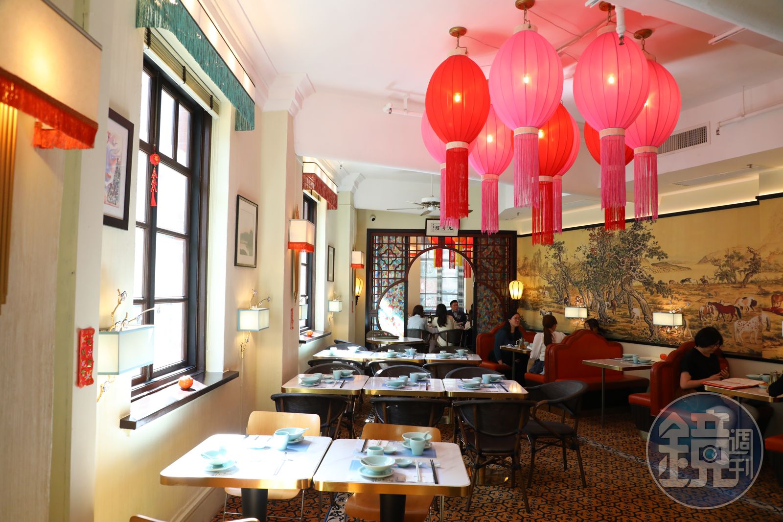 我爬上斜坡,從一扇小門進去,沿著窄窄的樓梯一路往上,沿路展示許多畫作,據說許多是曾在藝穗會舉行首次個展的藝術家如廖智恒、巢錫雄、藤原弘美、陳佩玲、曾翠薇和王純杰的作品,讓這段路走得特別慢。好不容易上到2樓,一踏進門,老式門窗、大紅燈籠、中式壁畫、花磚與桌上的青瓷餐具茶杯,王家衛電影《花樣年華》的氛圍感拉滿到快要溢出來。
