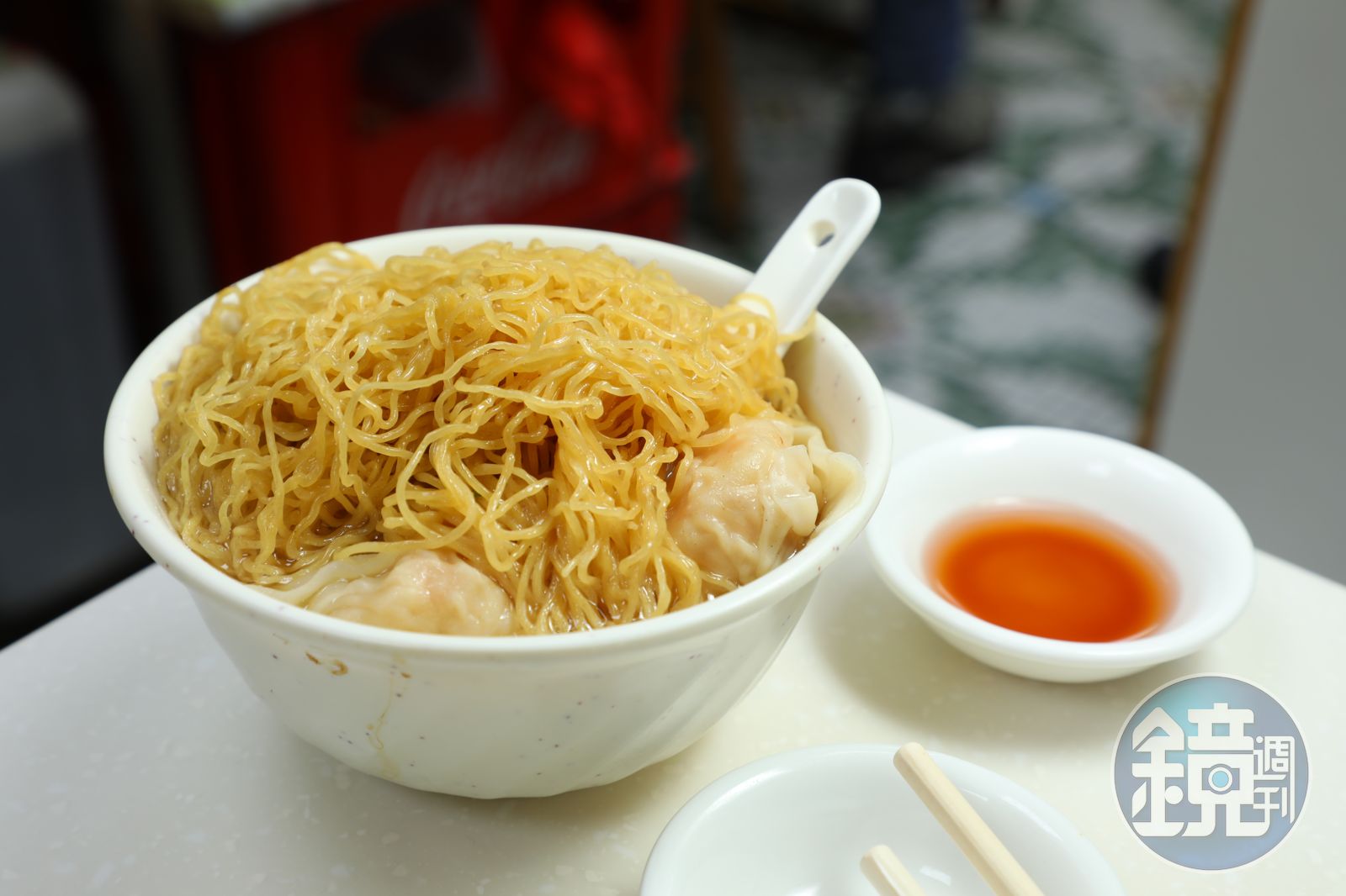一個比吃飯的飯碗稍大一點的瓷碗,盛著八分滿的湯,雲吞在下,麵條在上,一根瓷湯匙從中插入,隔開麵與湯,這種擺法讓麵條不會太快被湯泡軟,是古早傳下的手法。