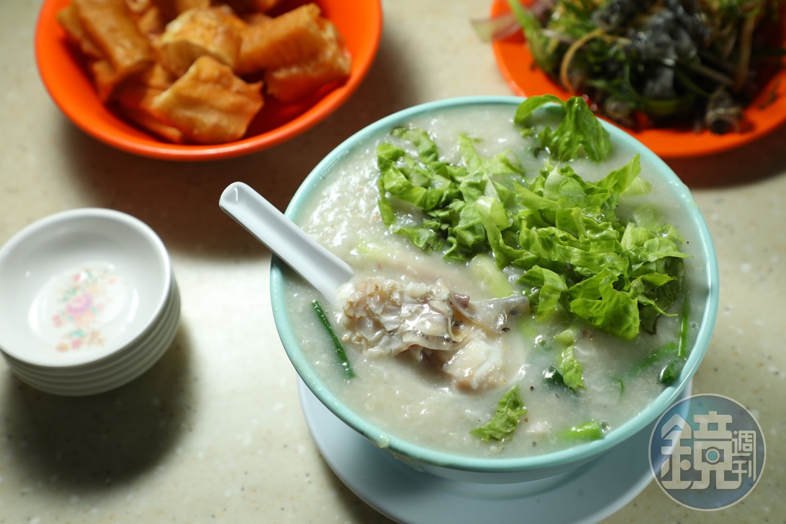 魚皮先端上來,非常厚實Q彈,沾點醬汁和蔥薑一起入口,清爽開胃,一點不腥,還有種涮嘴的快感。「牛肉魚片粥」和「魚腩粥」的粥面上都撒了一大把生菜,我又另外加點了「油條」。先喝一口略帶褐色的粥湯,湯裡能嘗到魚鮮味,再把生菜全部拌進粥中,頓時多了清爽感,再把脆硬油條浸在粥湯裡吃,鹹鮮脆三種味覺口感平衡得剛剛好,還沒吃到魚肉,已經十分滿足。