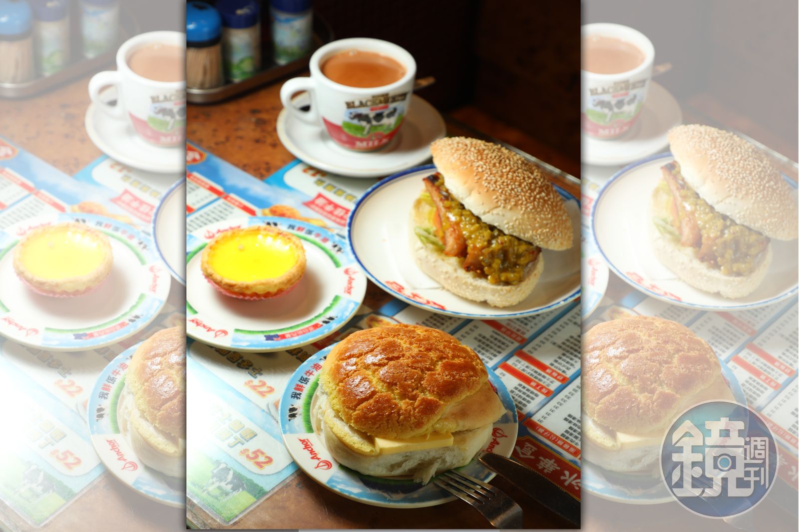 除了菠蘿油,金華冰廳還有「鮮油西多士」「酥皮蛋塔」「特大豬扒包」「港式鴛鴦」及各式各樣的粉麵組合,西多士油潤噴香;自家製蛋塔餡料滿滿;特大豬扒包個頭驚人之外,麵包酥脆有嚼勁、酸黃瓜佐料畫龍點睛、咖啡加奶茶的港式鴛鴦,在在都是熟悉的風味。