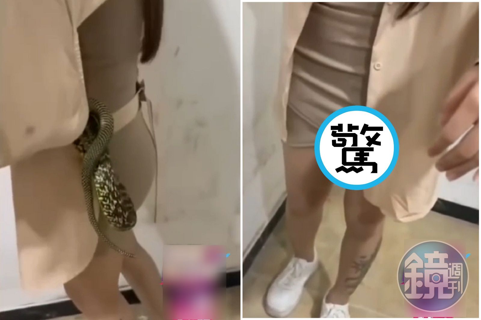 影片可見,一群朋友讓正妹體驗「大冒險」,把一條青色花紋的蛇放在她身上蠕動。不過這條蛇發揮本能,一直往陰暗處鑽,最後更直接色色地鑽入正妹的裙下,並直搗「幽暗陰穴」的方向,讓正妹瘋狂大叫:「牠鑽到我下面,啊啊啊啊!」 不少網友看到影片後,都紛紛驚呼:「這蛇太牛逼!」、「妹子懂玩,蛇也懂玩。」、「完了,這蛇會變很臭的。」、「搞到變死穴?」、「蛇果然是穴居類動物。」、「想知道後續。」