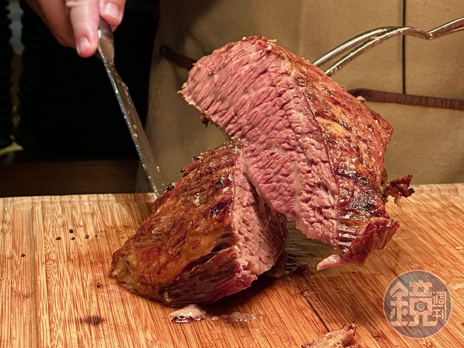 第一種是靠腹部的油花面,肌理明顯、口感扎實,充滿油花香氣,搭配特製莎莎醬可以解膩。第二種是筋肉面,但不用擔心會難咬,因為已經烤到軟化,很好咀嚼。第三種是我覺得最好吃的帶骨肉,也就是俗稱的牛肋條,表皮酥脆,肉香濃厚,還咬得到軟彈的牛筋。