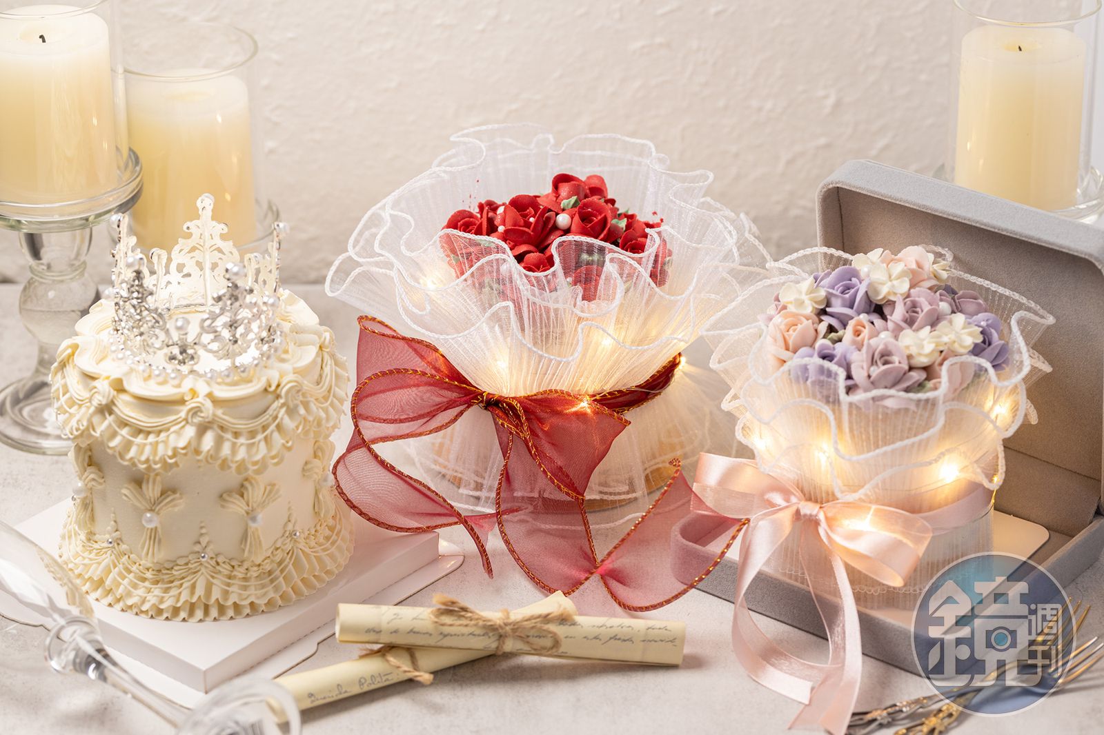 必須提前兩週預訂的「花束蛋糕」,因為能一次傳達雙份心意,每到情人節就讓大花訂單接到手軟。大花發現,很多客人認為與其買一束鮮花,再買一個蛋糕,不如挑選兼顧外型又實吃的花束蛋糕。而且裱花蛋糕除了能依照客人需求客製外型與配色,大花也提供香草與巧克力兩種蛋糕體,以及巧克力或百香果慕斯、莓果、酒漬櫻桃、自製布丁等五種內餡給客人選擇。
