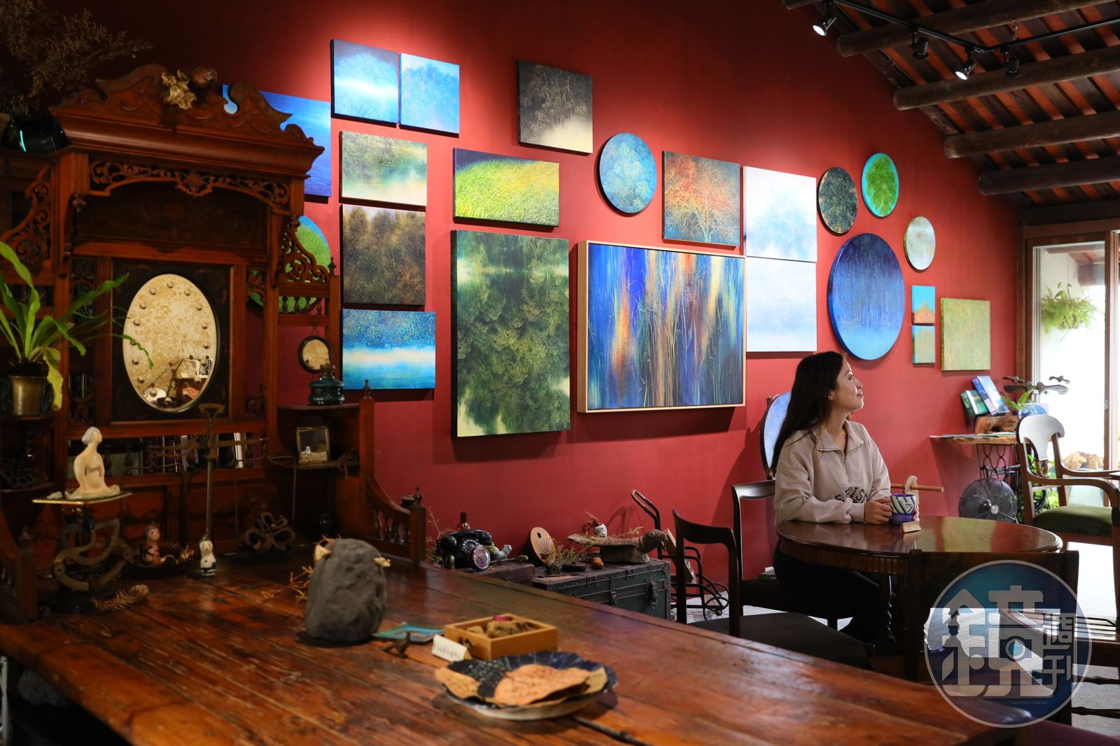 二樓的空間,同樣令人醉心痴迷。屋子前後刻意往外推移,無論視線向前或向後,都能將天光和鄰居的紅屋瓦納入;保留難得的整面土角牆,不僅脆弱維護不易,當初修復也是費心費工,只為了讓民眾近距離認識台灣傳統屋式;濃厚的紅色牆面與方才樓下的藍綠有著反差,呈現出些微庶民奢華感,牆上同樣掛著吳冠德其他的小幅畫作。