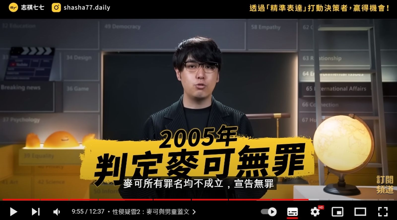 YouTuber志祺七七新片,談論已逝的傳奇巨星麥可傑克森的成就與爭議,不過卻因標題封面遭網友罵翻。(翻攝自志祺七七 X 圖文不符 YouTube頻道)