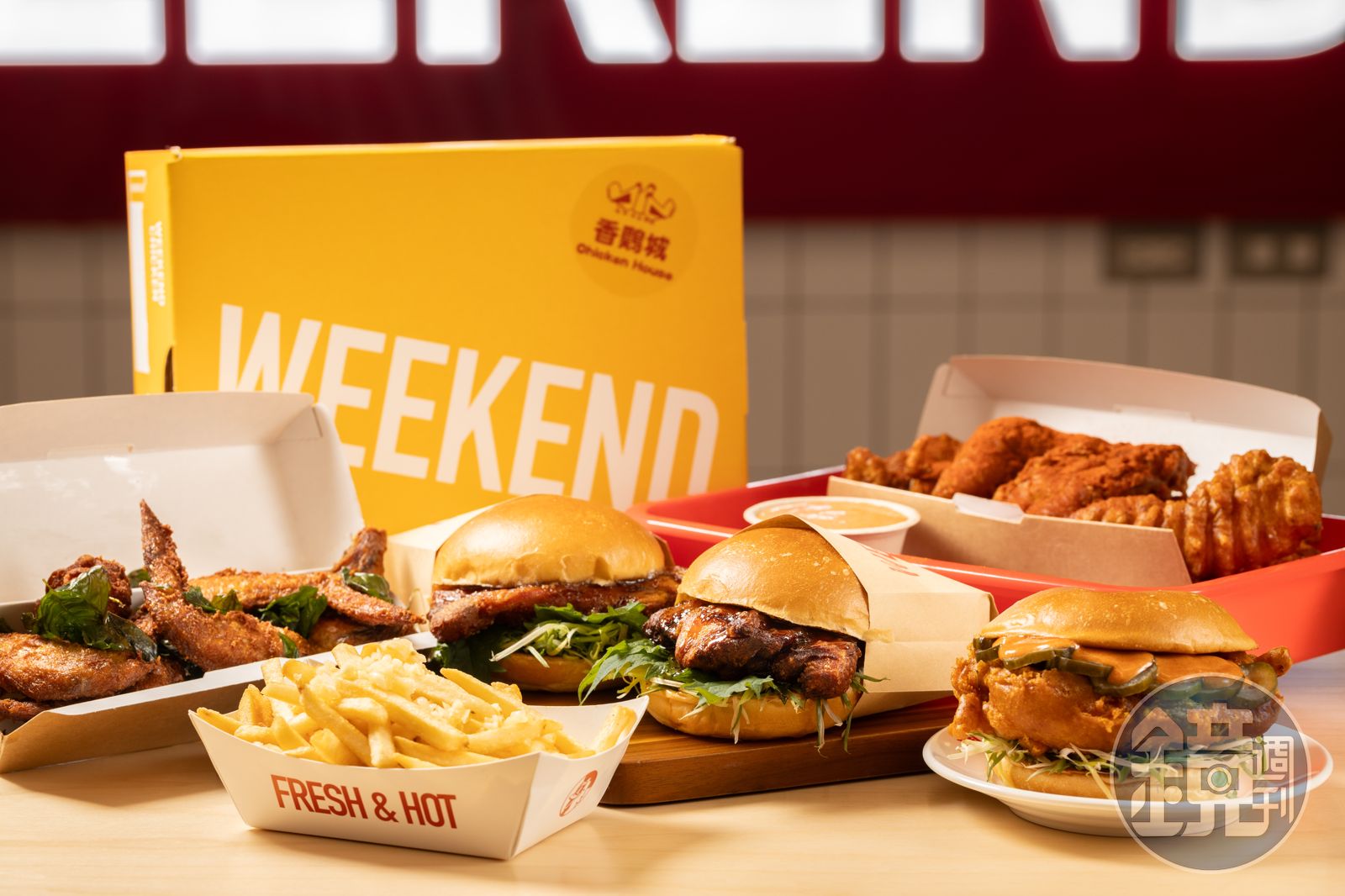 品牌性格鮮明的「WEEKEND CHICKEN週末炸雞漢堡俱樂部」,店內採用大膽的紅白色系,既有美式快餐風格又見得著台式小吃的身影,甚至將流水席圓桌搬進店裡,台味十足。雖販售速食快餐,但主理人JEEK將經營理念定義成「小吃店」,以蔥蒜取代番茄醬與黃芥末,堅持「台辣」才是王道,用熟悉味道連結記憶,記憶才能永存。