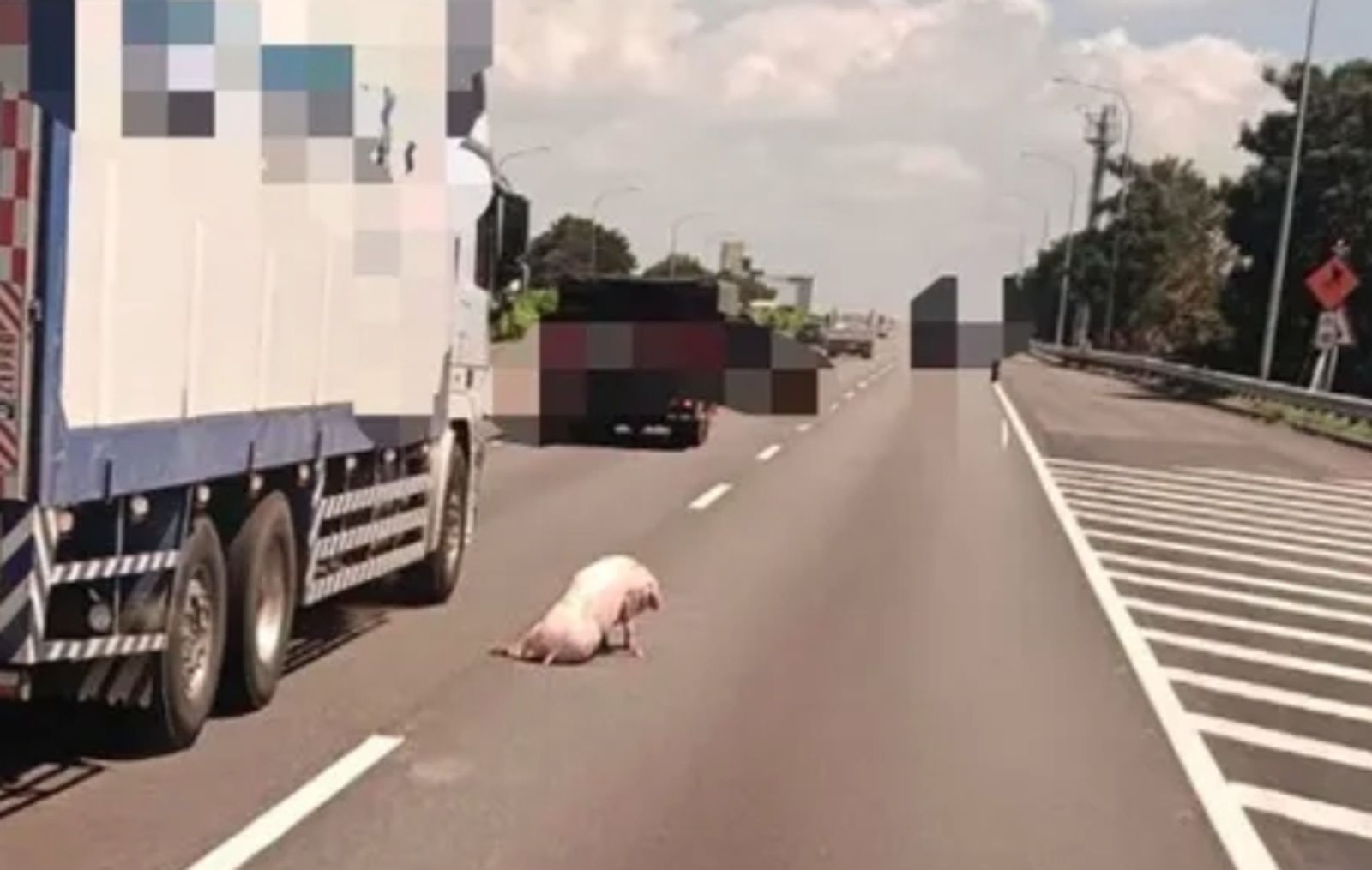 今(2日)上午,國道1號中山高北向251公里處,居然有一隻「天外飛豬」出現在車流來往的道路上,疑似是從運貨車上摔落,小豬摔下後驚嚇過度動彈不得,腳軟得癱坐在原地,後方車輛見狀也紛紛閃避。