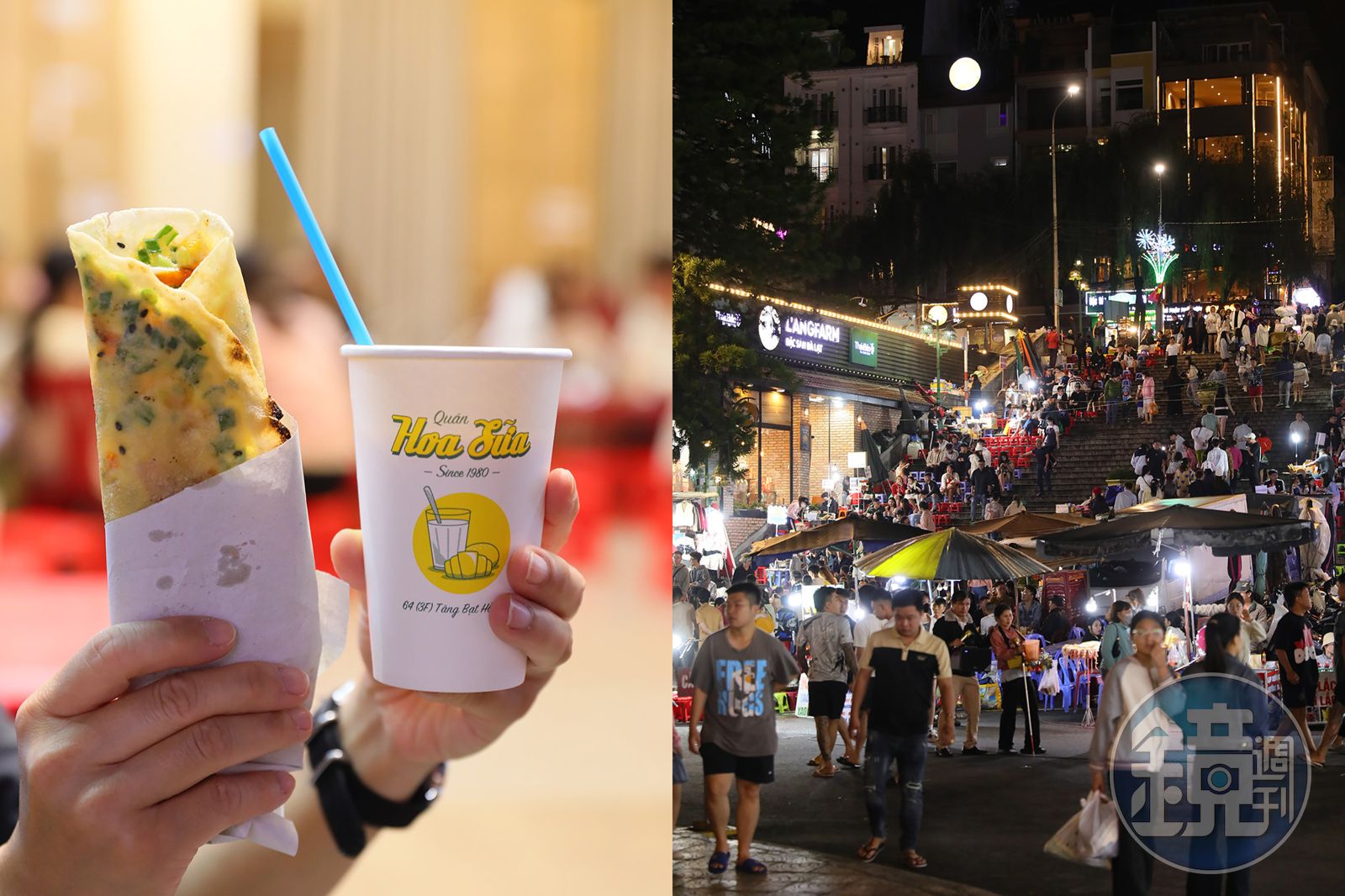 夜市旁還有間開業40年的豆漿店「Quán Hoa Sữa」,當我們走進店門口才發現整條巷子都在賣豆漿,Quán Hoa Sữa的豆漿相當濃醇,最大特色是豆漿裡泡著香蘭葉,細品還嘗得到芋頭與椰香,另一個與豆漿變成宵夜標配的是烤米紙,在餅上撒滿蛋液、熱狗切片與起司,酥脆的口感有點像台式可麗餅。