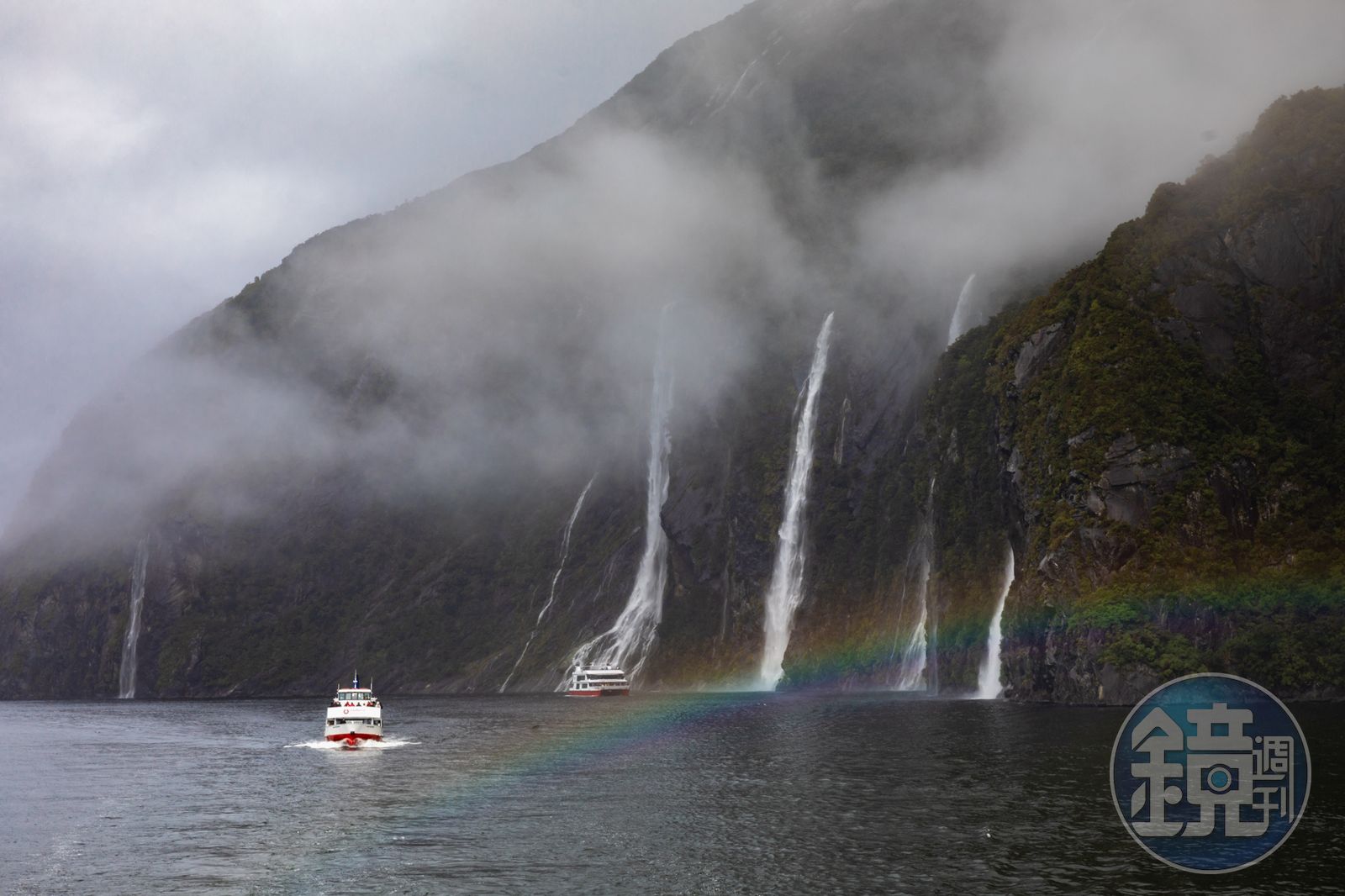 欣賞米佛峽灣最便捷的方式是乘船,運營的船家很多,遊船皆從米佛村的碼頭出發,旅行社為我安排的船程是2個小時,包含一頓船上自助餐。吃過飯後我便幾乎都待在甲板上,欣賞從峽灣水面拔地而起的山峰、高處流瀉而下的波溫瀑布(Bowen Falls),以及因連日降雨形成的臨時「動態」瀑布,當然還有最終抵達的遼闊塔斯曼海,沿途景色令人目不暇給。