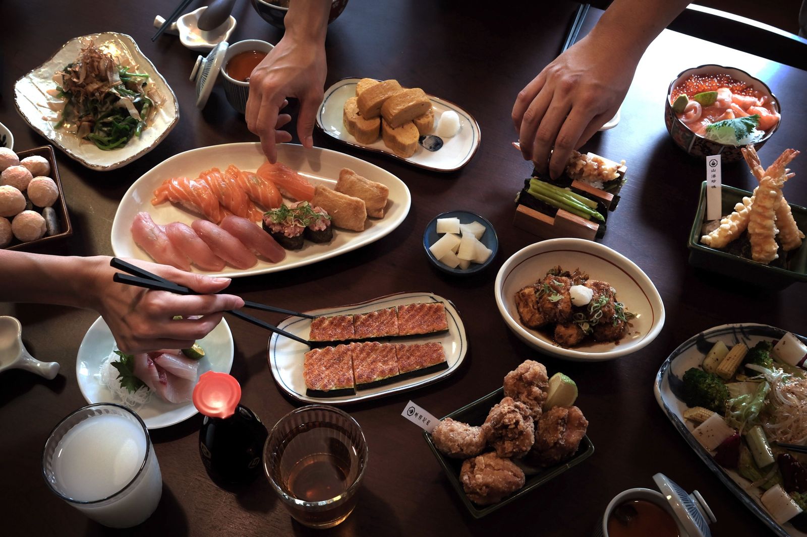 師傅現點現做的「鮪魚握壽司」「鮭魚握壽司」「軟絲握壽司」「蔥花鮪魚軍艦」;菜單上的「鮪魚刺身」「鮭魚刺身」「當季精選刺身」與「蘆筍手卷」「炸蝦手卷」「魚卵手卷」;「蔥花燒牛丼」「絕品海鮮丼」「月見蔥花鮪魚丼」等多達37種經典品項,通通無限供應。