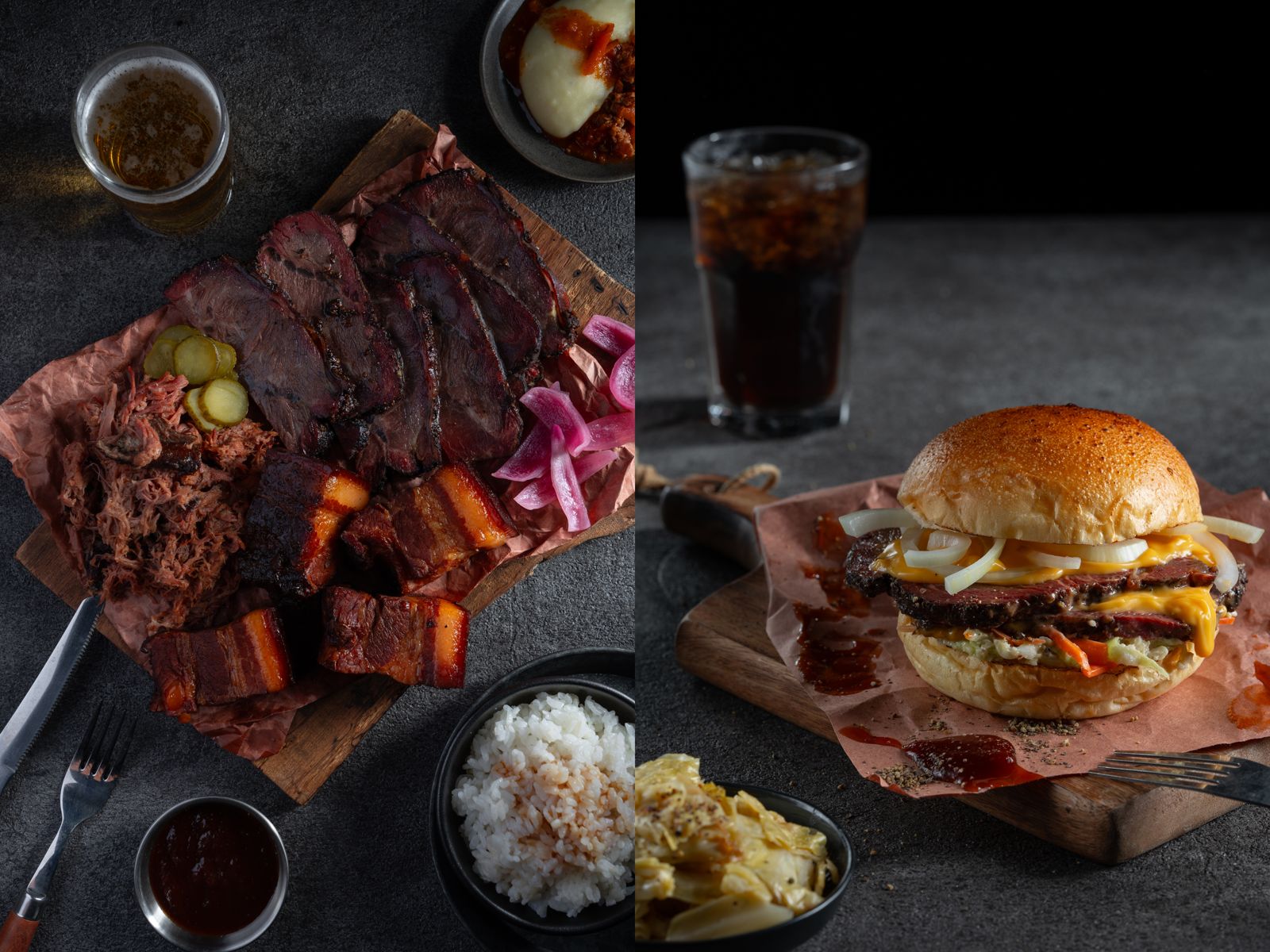 不吃牛的人,可以選擇「煙燻豬肋排」與「煙燻豬五花」,豬肋排採用傳統的「聖路易排切豬腩排」 (St. Louis Spare Rib),規整的切割與豐富的油脂,使其能承受超過6小時以上的長時間煙燻,搭配經典的美式SPG乾醃料組合,鹽巴、黑胡椒、蒜粉再加入五香粉與煙燻烤肉抹醬調味,完美呈現台灣人最愛的鹹甜滋味;豬五花則以傳統料理中式東坡肉為靈感,融合德州烤肉的二段式煙燻燒烤技法,炒糖色增添色澤與風味,將帶皮台灣豬烤至化口,打造出近似於東坡肉的口感與外型,風味卻截然不同。