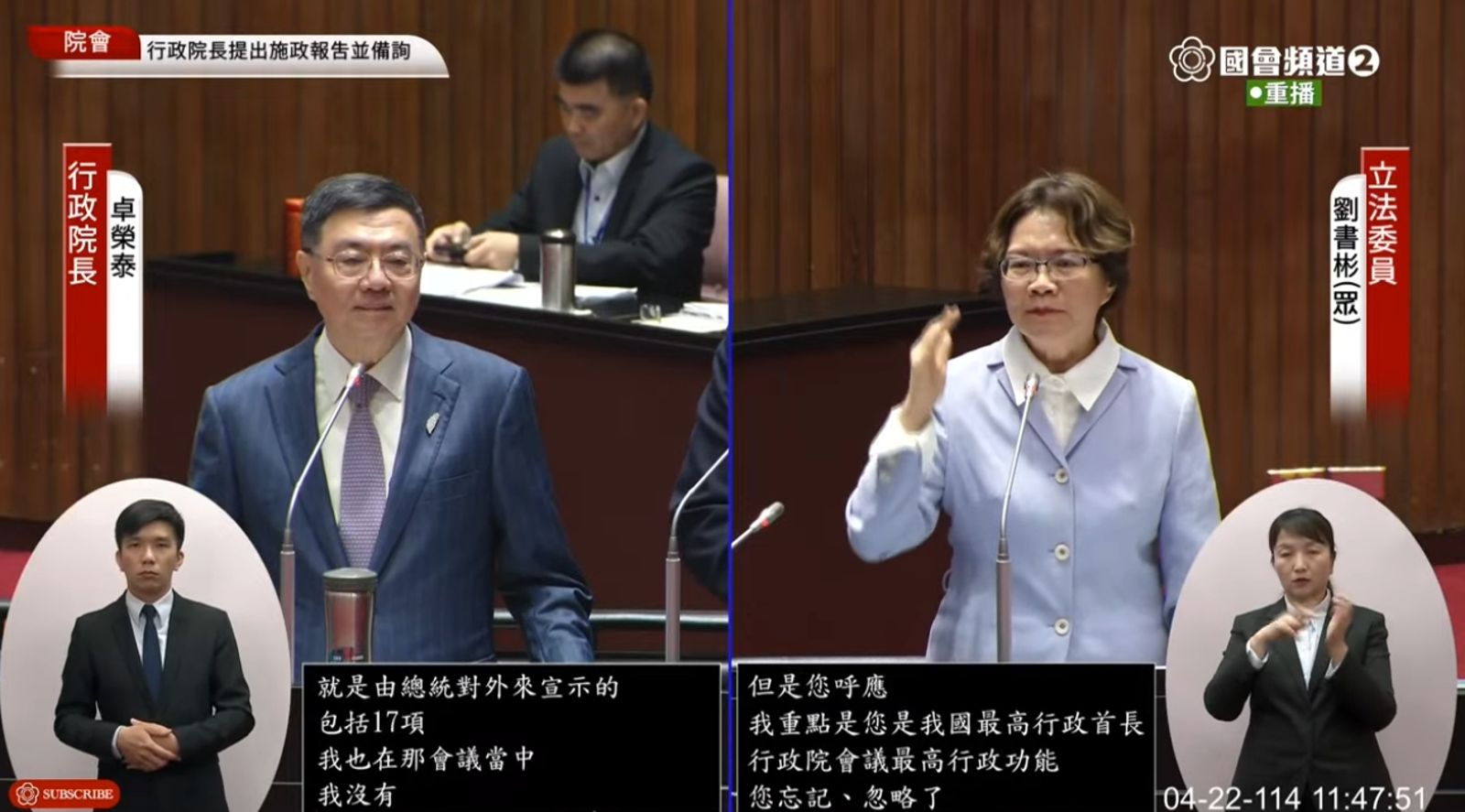 陸委會主委邱垂正反擊,不該用中國《反分裂法》來匡列兩岸互動,而且總統也是依據立法院通過的《反滲透法》定義,「中國對台極限施壓、步步進逼,哪一項不是境外敵對勢力?全世界都知道中共對台嚴重威脅,這是客觀事實、舉世公認的對台威脅,法律是一回事,但難道這樣的威脅委員沒有感受到嗎?」對於劉書彬強調維持現狀是主流,行政院長卓榮泰表示,台灣沒有要從任何國家脫離出來,目前台灣沒有要從中華民國脫離出來,「我們是主權獨立的國家。」
