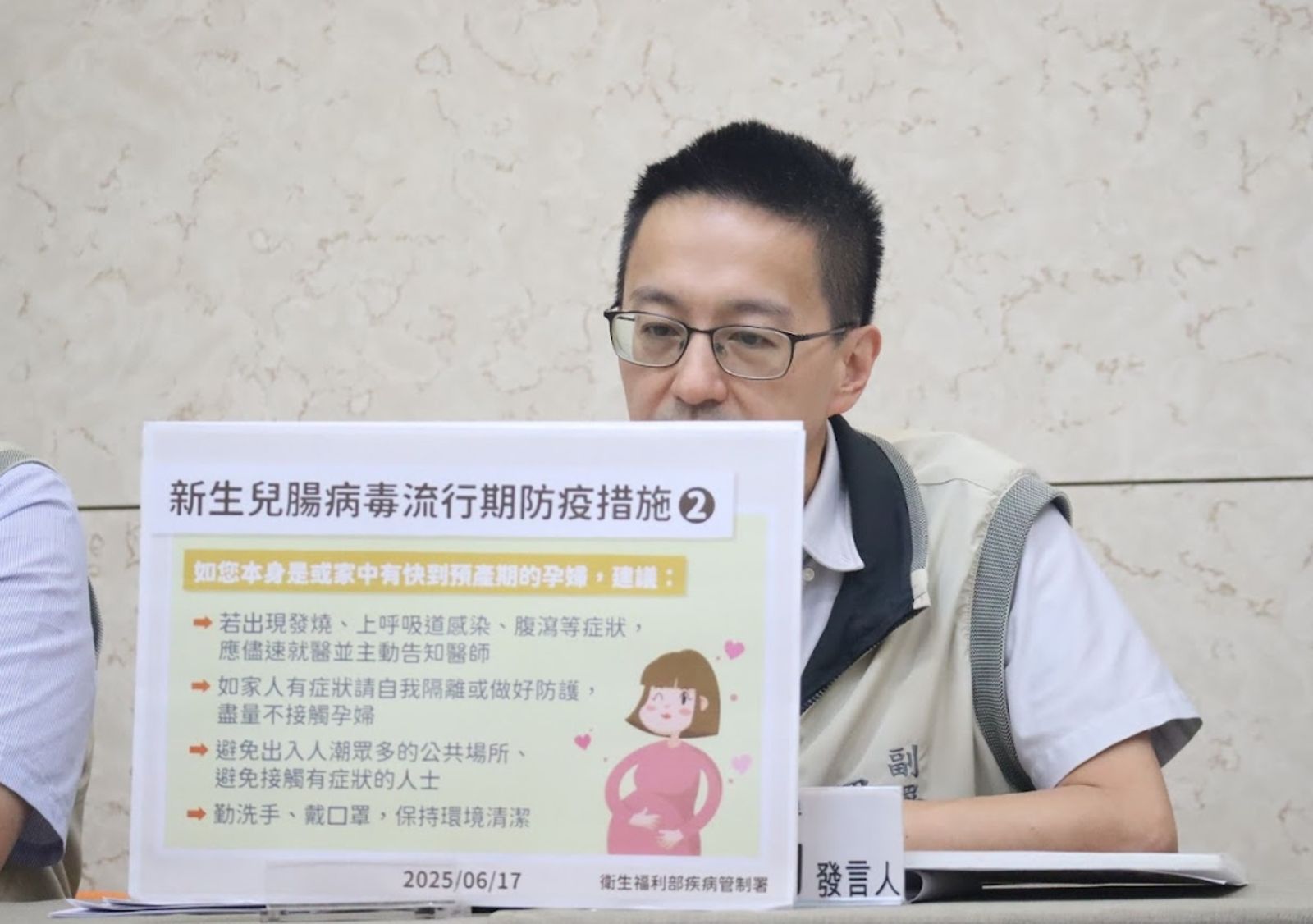 提醒民眾,新生兒感染後的症狀從發燒、活力不佳、食慾降低等輕微症狀,到腦炎、肺炎、多重器官衰竭等重症都有可能發生。因此,準媽媽的防護措施及注意自身健康狀況相當重要。
