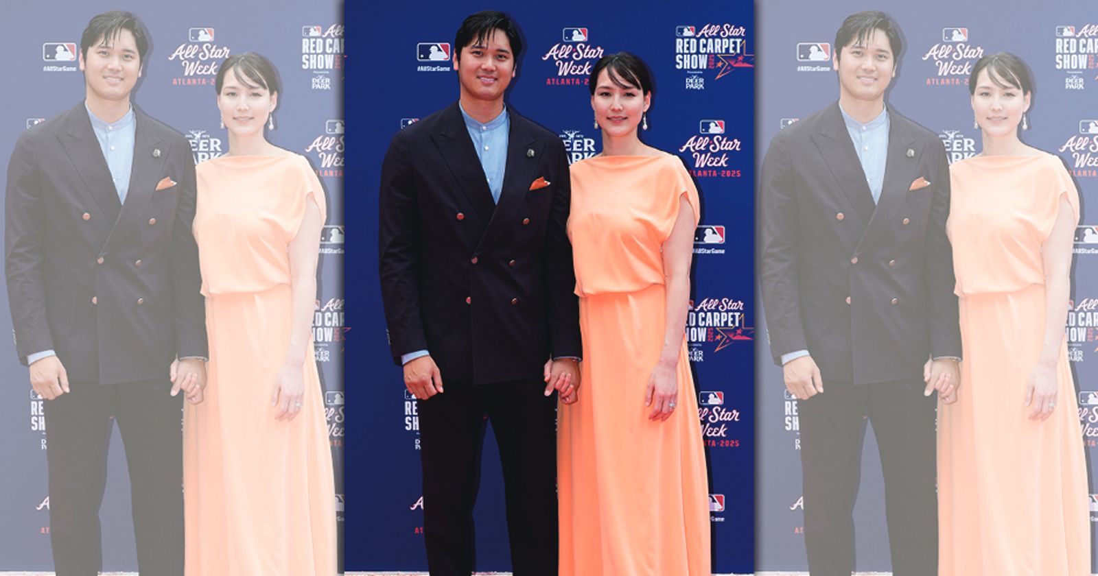 大谷與愛妻田中真美子走紅毯,真美子一襲水蜜桃色長禮服美翻。(翻攝X@MLB)發布時間:2025.07.16 10:29 臺北時間
