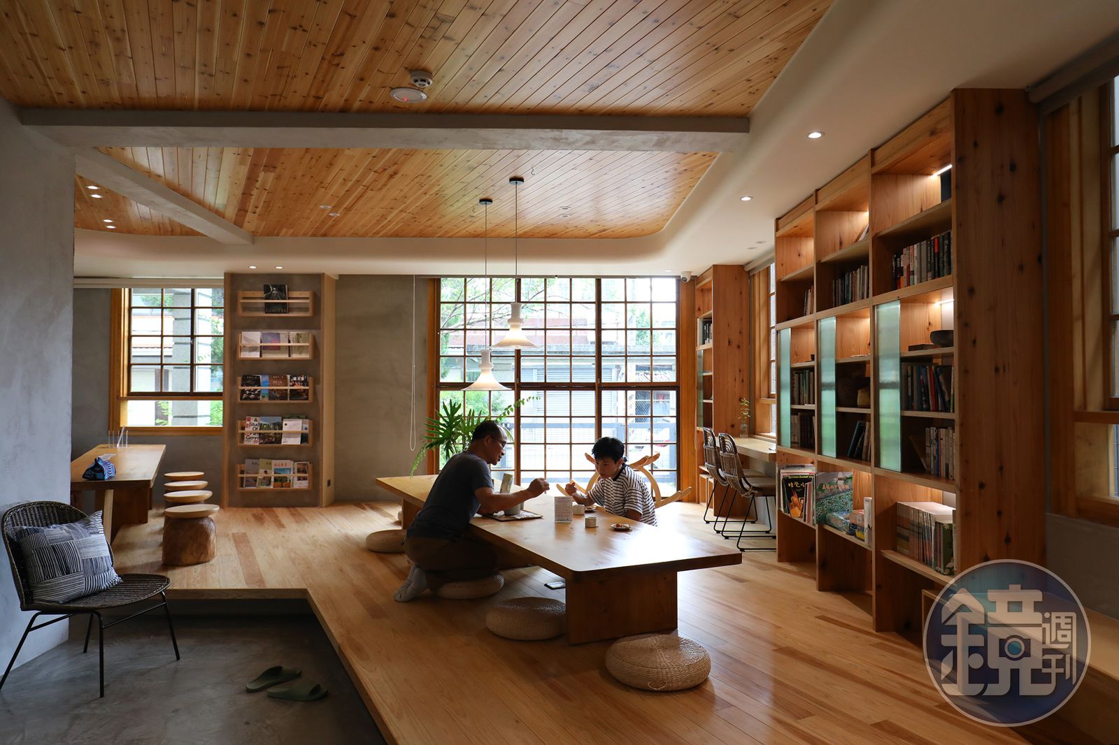 「山嵐」房描繪山頂霧氣繚繞的景象,空間帶有侘寂風格。拉開「田水」房的窗簾,北埔的綠意盎然映入眼簾。客房內除了提供藍牙喇叭,擺放的書籍也都與客房主題相互呼應。一樓地板保留老屋原有的白色大理石紋,並設計成河流曲線,呼應孕育北埔的大坪溪;回收的老木窗、舊木頭圓桌,都在空間中散發出溫潤的歲月痕跡,讓在地元素與建築美學相輔相成。