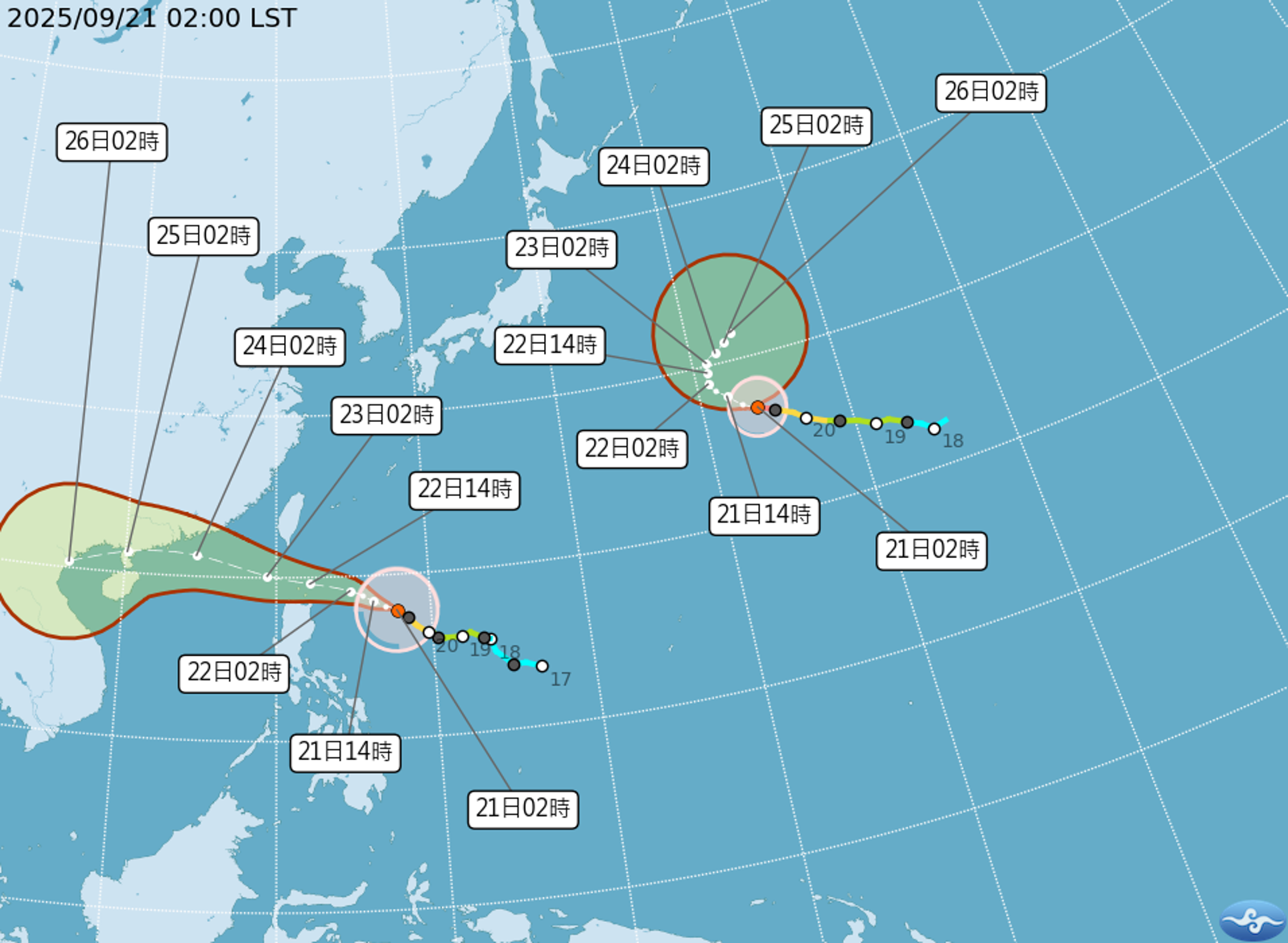 另,昨德增強為中颱的颱風樺加沙,持續朝西北轉西北西方向移動,氣象署預計今(21日)上午發布海上颱風警報,晚間也恐發布陸上颱風警報。根據最新路徑,樺加沙22日至24日會離台灣最近,影響最為顯著。