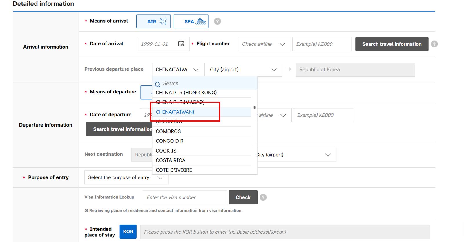 韓國外交部針對電子入境卡系統中,「出發地」及「下一目的地」欄位將台灣列為「CHINA (TAIWAN)」一事做出回應。(翻攝韓國E-Arrival Card官網)發布時間:2025.12.11 16:46 臺北時間