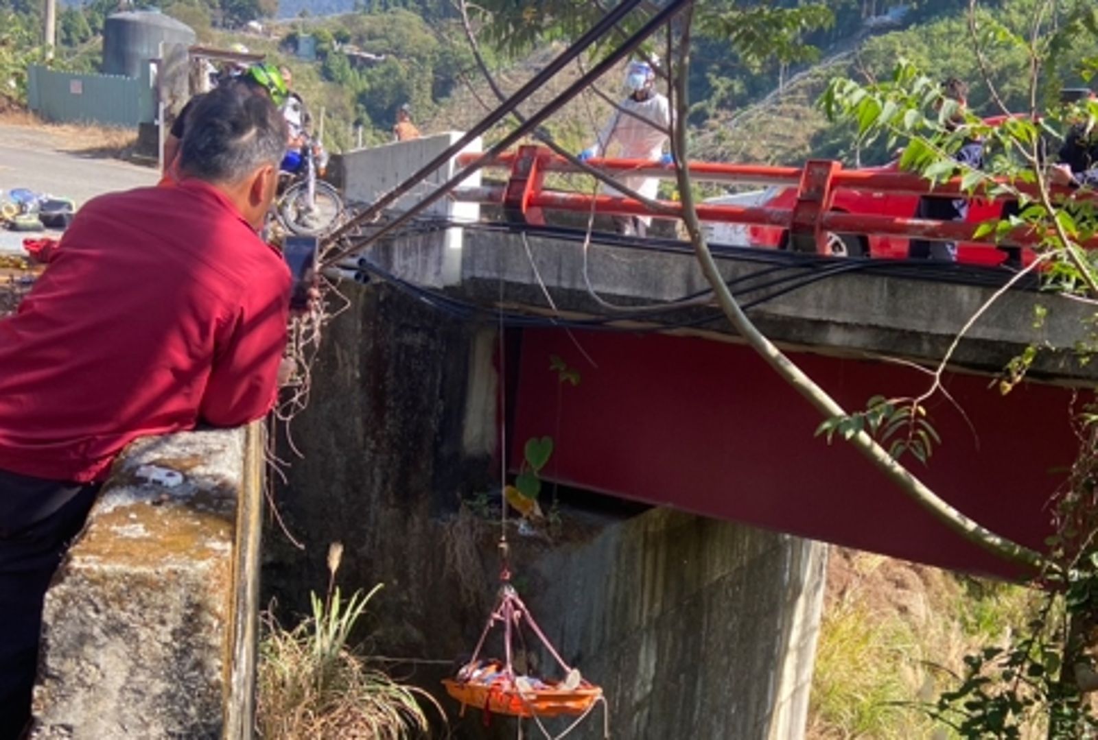 警消12時56分已將傷者吊掛至路面,給予必要急救處置後由雙崎91車送往東勢農民醫院救治,至於詳細事發原因,仍待釐清中。