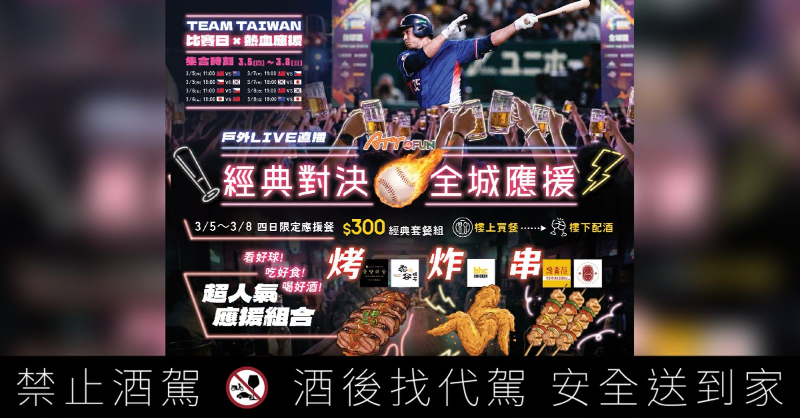除了戶外巨幕Live轉播,「城市下酒祭」也同步登場,ATT 4 FUN此次集結了7間戶外酒吧與4間主題餐廳推出應援限定活動。bhc CHICKEN、鳥貴族、中央韓鍋酒舍、梨谷韓式烤肉皆推出300元應援外帶限定套餐,球迷可於館內購買後帶至戶外廣場觀賽享用,打破場域界線,讓餐飲與賽事熱血無縫接軌。