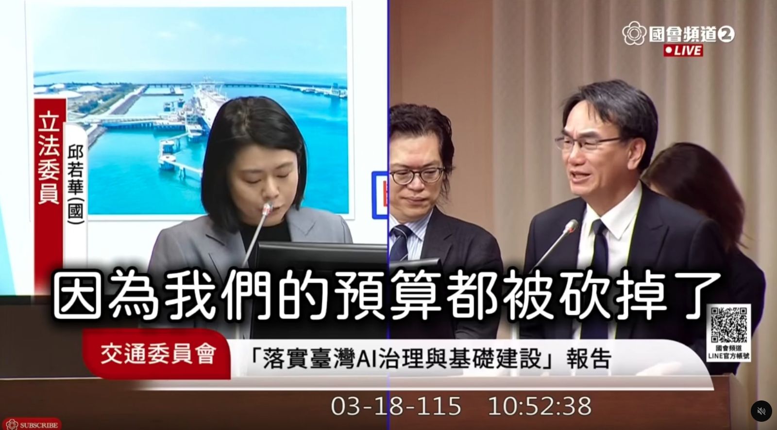 部長林宜敬在答詢時解釋,數發部原規劃去年就要增加算力基礎建設,但因預算遭大幅刪減,導致去年「1片都沒有增加」。他更當場向立委喊話,強調現在許多企業的算力已達萬顆等級,若要強化硬體,還請立委多多支持預算。這番回應讓現場氣氛一度尷尬,邱若華隨後改口允諾會支持相關資源挹注。