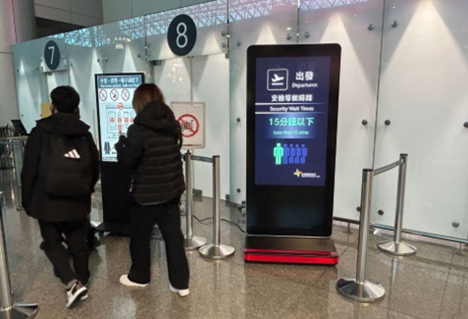 為方便旅客掌握時間,機場公司導入「AI出發安檢人流統計」,於出境驗票口設置預估通關時間告示牌,以「人像數量」及「顏色燈號」呈現安檢等候情形;旅客亦可透過桃園機場官方APP查詢「安檢等候時間」,建議提前掌握現場狀況並儘早完成安檢作業。